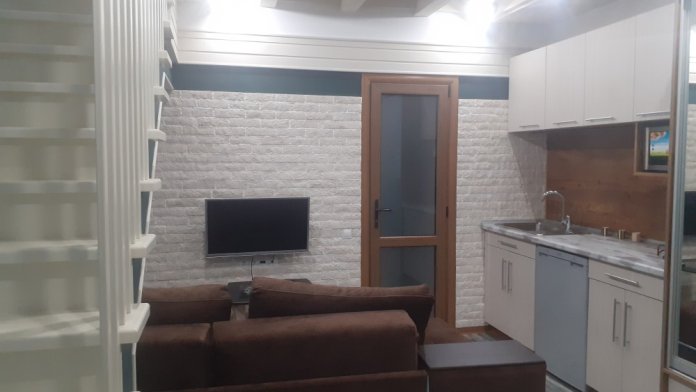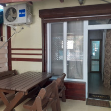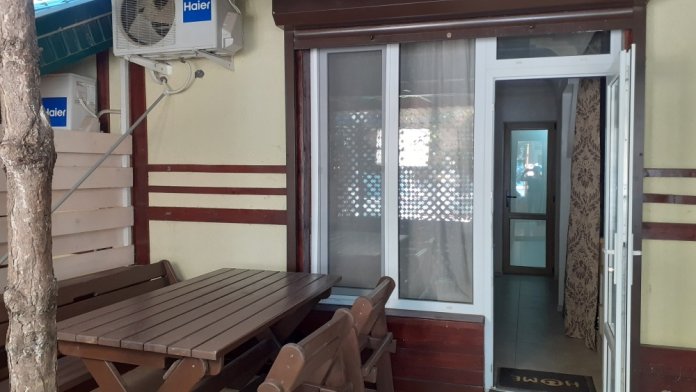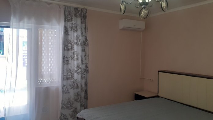 В номерах: раскладной диван+доп. место, необходимая мебель( шкаф, комод, стол, стулья), маленькая кухня, душевая комната с туалетом, холодильник, кондиционер, интернет, TV кабельное, вся необходимая посуда. Апартаменты трёхместные. До моря 50 метров