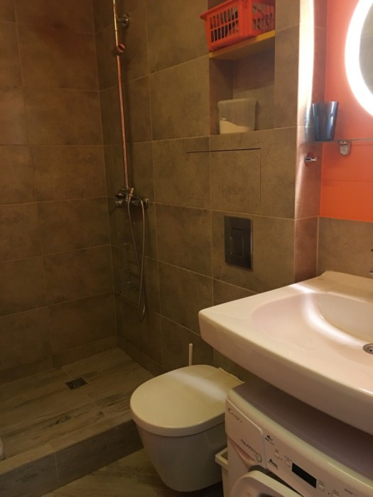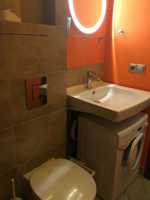 Санузел: водонагреватель, стиральная машина, душевая, унитаз, раковина, полотенцесушитель.