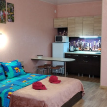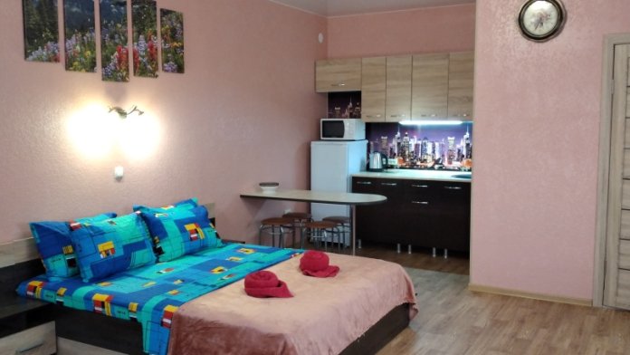 В апартаментах-студии на 2-5 человек: сейф, кухонный уголок с мойкой, микроволновая печь, посуда, шкаф, комод, диванчик, в санузле - бойлер. Мебель в номере: кровать двуспальная (два взрослых), диванчик (два ребенка) и возможно еще дополнительное место - раскладушка.