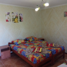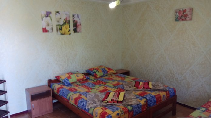 В номере есть вентилятор. Стоят 3 полуторные кровати, которые передвигаются и кресло-кровать. Возле кроватей стоят две тумбочки, шкаф для хранения вещей, холодильник, телевизор. Так же в номере есть санузел и душ (холодная и горячая вода круглосуточно). Вход в номер у всех отдельный. Возле каждого номера есть своя верандочка, где стоит стол и стулья. Здесь можно просто отдохнуть или покушать. Веранду украшает очень красивая озелененная жимолость, которая всегда создаст вам уют и теневую зону.