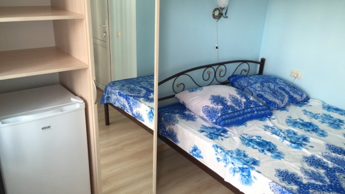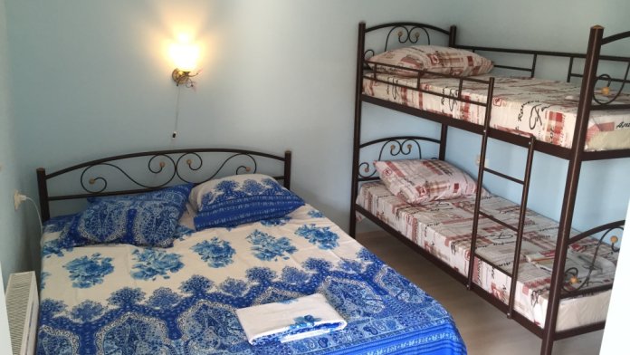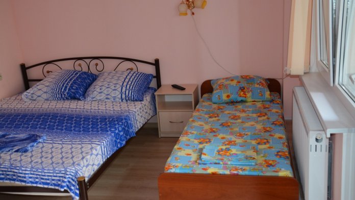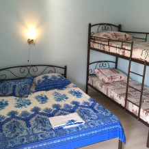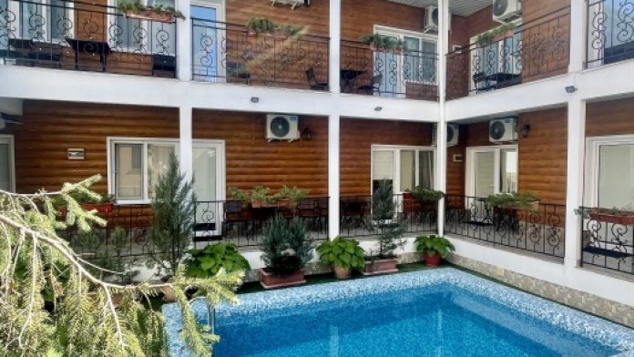 Территория гостевого дома закрытая, на территории есть: бассейн, общая кухня, мангал, сауна, зона отдыха со столиками и детский уголок. Поселиться в гостевом доме можно в 2,3 и 4-местных номерах. В каждом номере есть душ, туалет, кондиционер, холодильник и телевизор.
