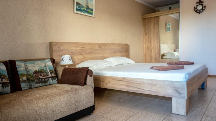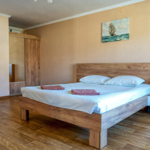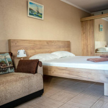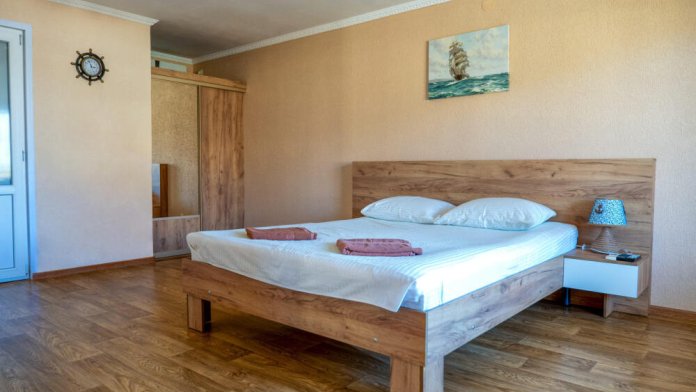 Номер «Семейный двухкомнатный» — это уютный, большой номер, выполненный в тёплой бежевой палитре, в современном стиле. Он состоит из двух комнат — гостиной и спальни. В спальне двуспальная кровать 160*200, в гостиной раскладывающийся диван и двухъярусная кровать. В обеих комнатах плазменный телевизор. Также в номере есть балкон с видом на море и закат. Подойдет как для проживания двух человек, так и для семей до 6 человек.