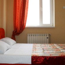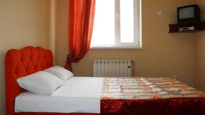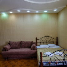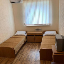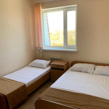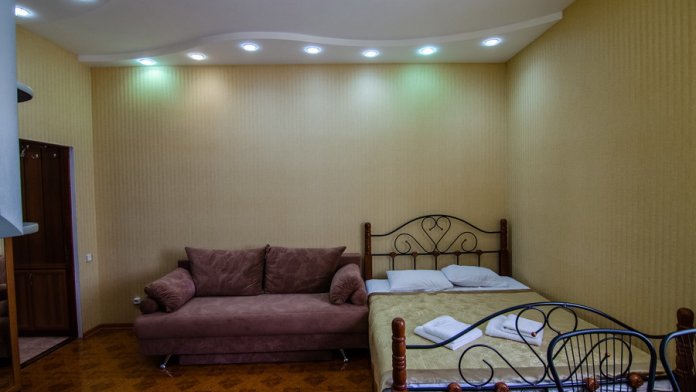 Однокомнатный номер с мини-кухней. В номере: одна двуспальная кровать, одна односпальная кровать, раскладной диван, телевизор, холодильник, кондиционер, прикроватные тумбочки, стол, стулья, платяной шкаф, телевизор, холодильник, кондиционер, интернет (WI-FI- зона), автономное водо- и энергоснабжение, индивидуальный комплект полотенец. В ванной комнате: душ, умывальник, унитаз, зеркало. Мини-кухня: электро- плита, микроволновая печь, электрочайник, набор посуды, раковина, подвесные шкафчики.