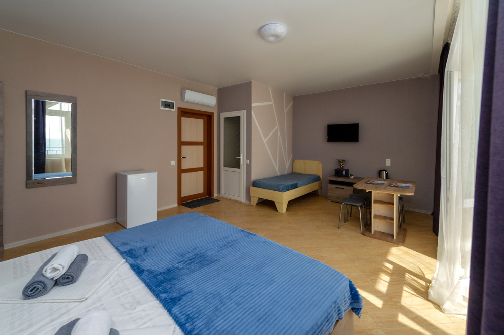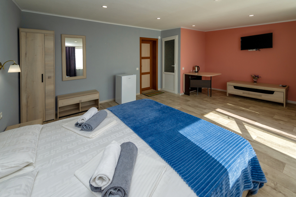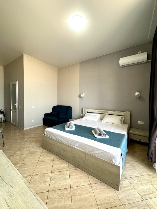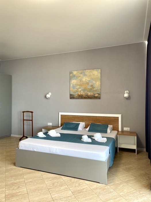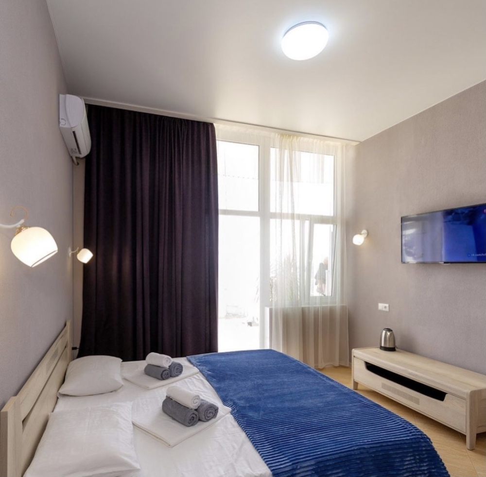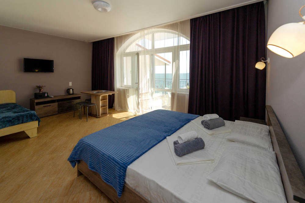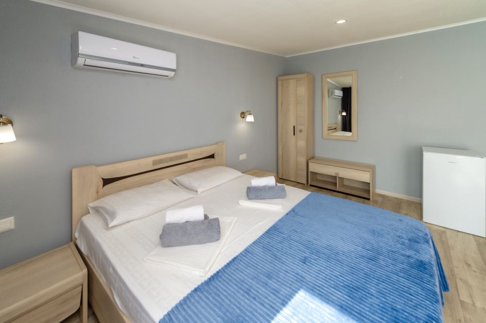 Элегантные номера оснащены кондиционером, телевизором с плоским экраном и спутниковыми каналами, холодильником, электрочайник, посудой (тарелки, ложки, вилки, стаканы, чашки). В каждом номере есть балкон. В номерах удобная современная мебель, ортопедические матрасы. Предоставляются постельные принадлежности, комплект полотенец, косметические принадлежности (мыло, шампунь, гель). В распоряжении гостей собственный пляж с шезлонгами, также игровая зона для детей.