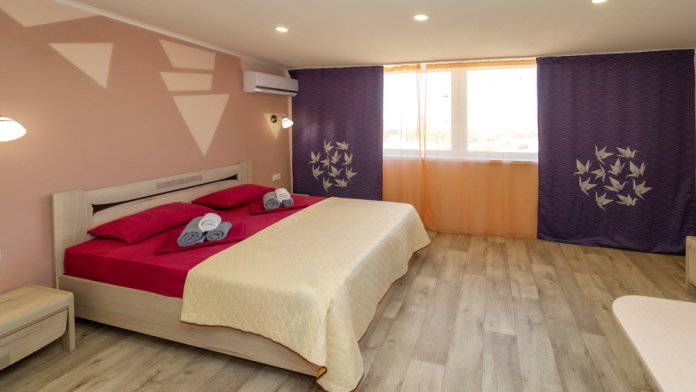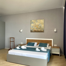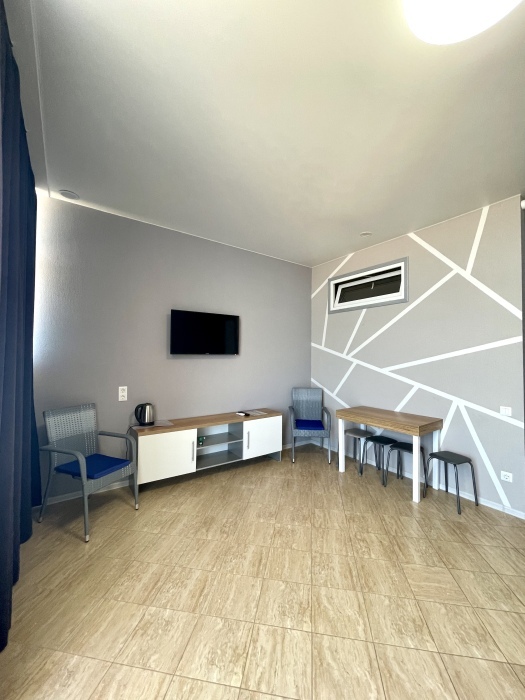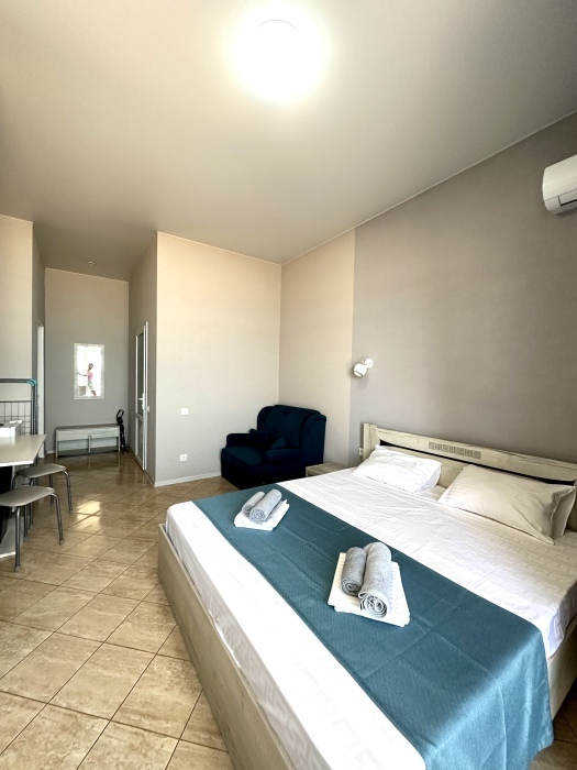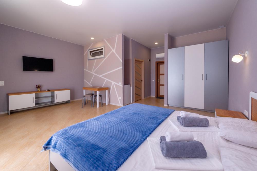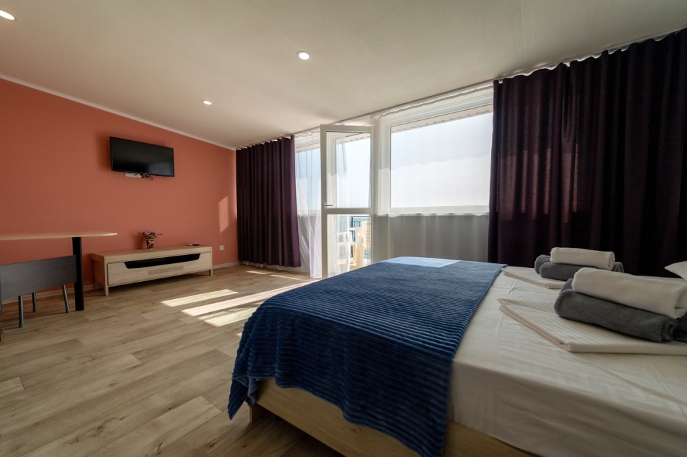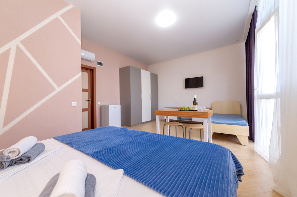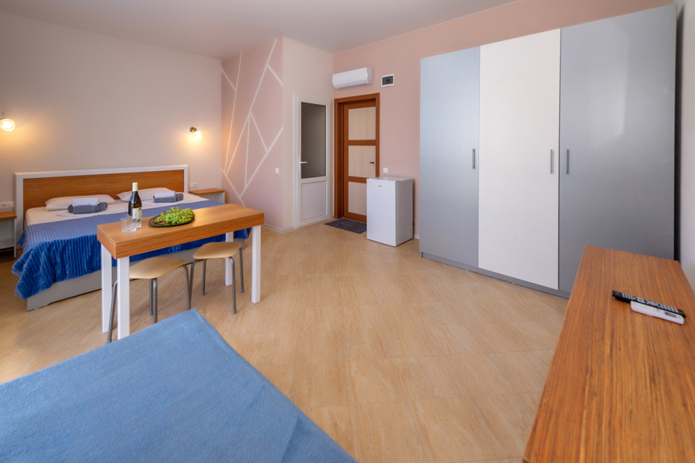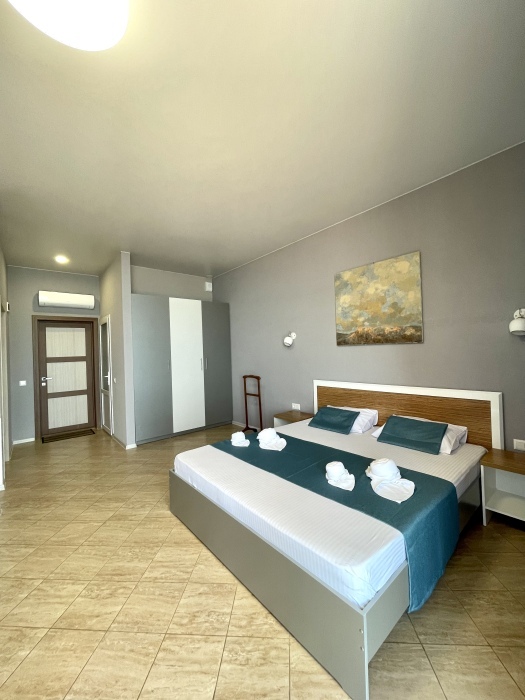 Элегантные номера оснащены кондиционером, телевизором с плоским экраном и спутниковыми каналами, холодильником, электрочайник, посудой (тарелки, ложки, вилки, стаканы, чашки). В каждом номере есть балкон. В номерах удобная современная мебель, ортопедические матрасы. Предоставляются постельные принадлежности, комплект полотенец, косметические принадлежности (мыло, шампунь, гель). В распоряжении гостей собственный пляж с шезлонгами, также игровая зона для детей.