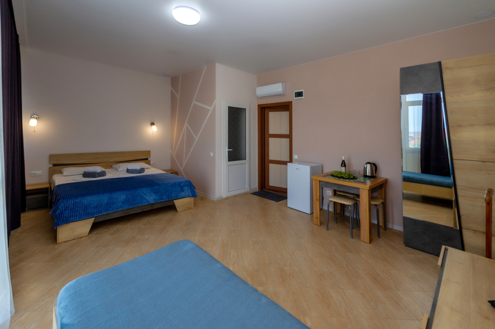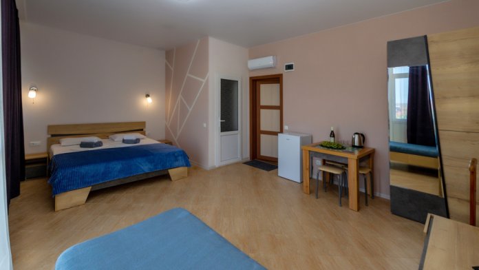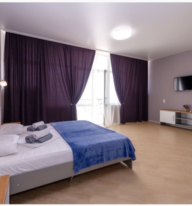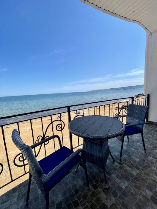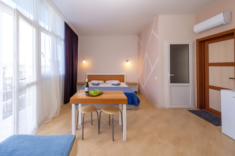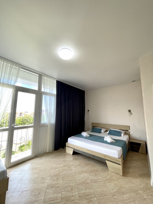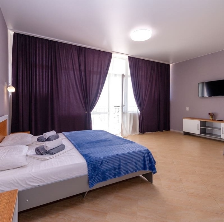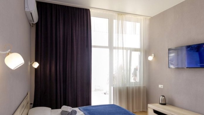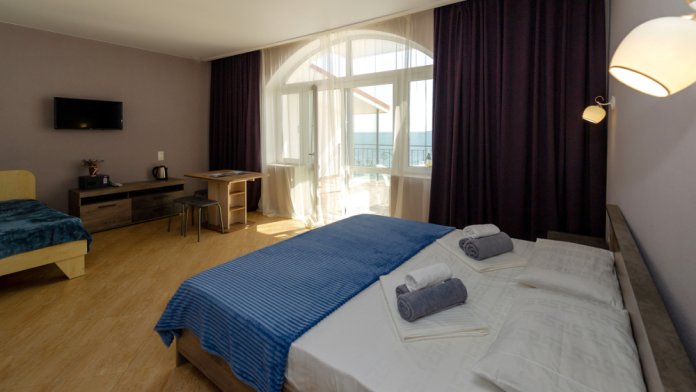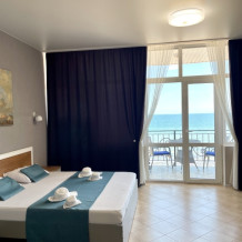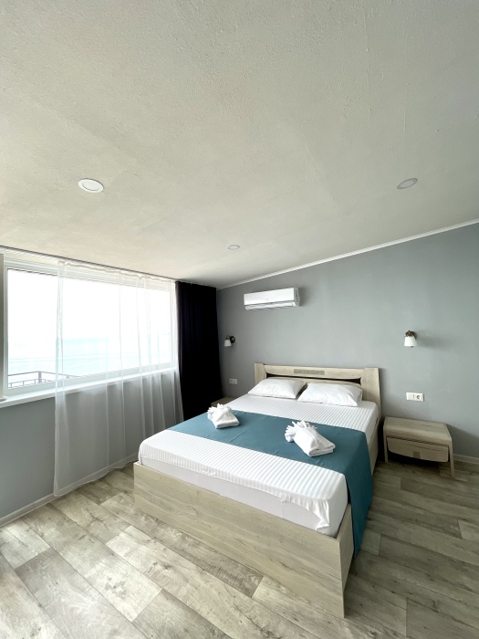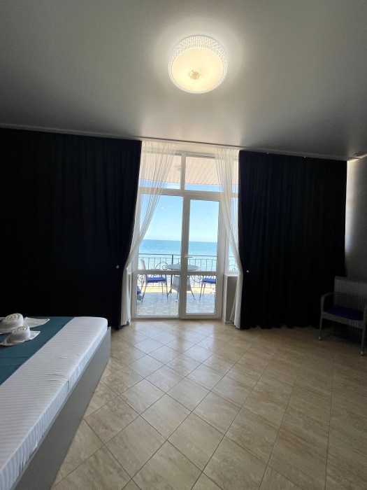 Элегантные номера оснащены кондиционером, телевизором с плоским экраном и спутниковыми каналами, холодильником,электрочайник,посуда(тарелки,ложки,вилки,стаканы,чашки).В каждом номере есть балкон .Номера с видом на море оснащены шезлонгами, также имеется на балконе стол и стулья для отдыха. В номерах удобная современная мебель ,ортопедические матрасы .Предоставляются роскошные постельные принадлежности,комплект полотенец,косметические принадлежности (мыло,шампунь ,Гель). В распоряжении гостей собственный пляж с шезлонгами ,также игровая зона для детей.