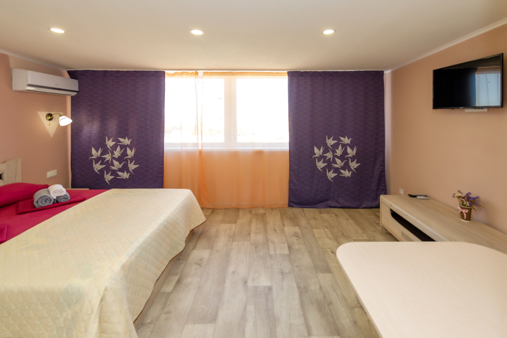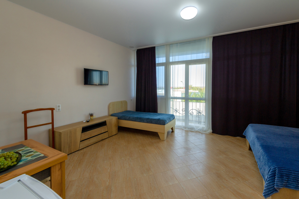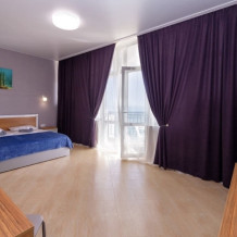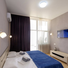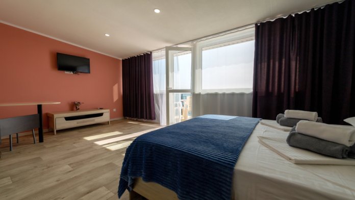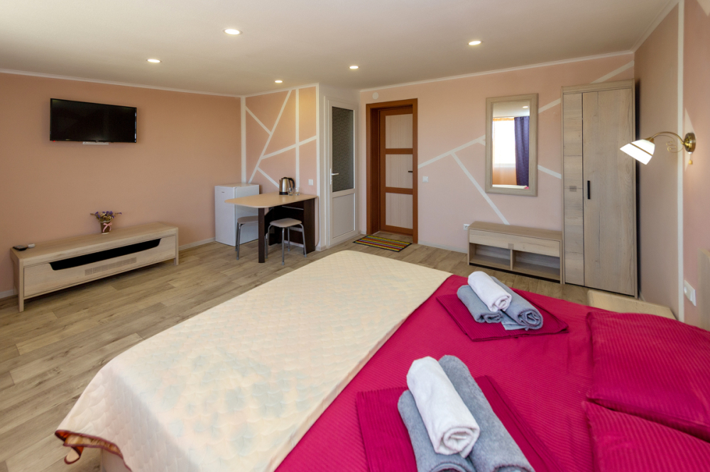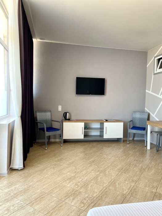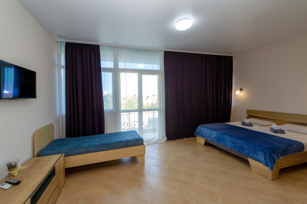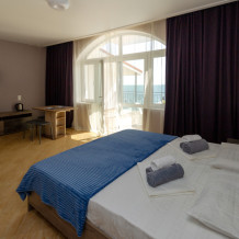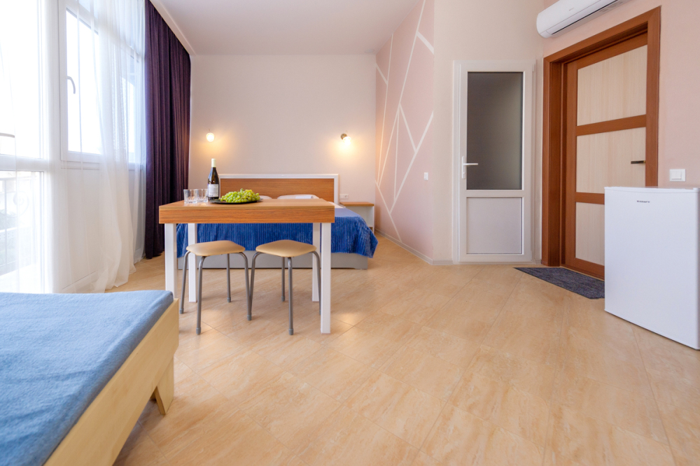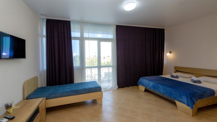 Элегантные номера оснащены кондиционером, телевизором с плоским экраном и спутниковыми каналами, холодильником,электрочайник,посуда(тарелки,ложки,вилки,стаканы,чашки).В каждом номере есть балкон .Номера с видом на море оснащены шезлонгами, также имеется на балконе стол и стулья для отдыха. В номерах удобная современная мебель ,ортопедические матрасы .Предоставляются роскошные постельные принадлежности,комплект полотенец,косметические принадлежности (мыло,шампунь ,Гель). В распоряжении гостей собственный пляж с шезлонгами ,также игровая зона для детей.
