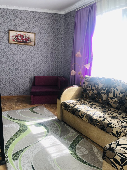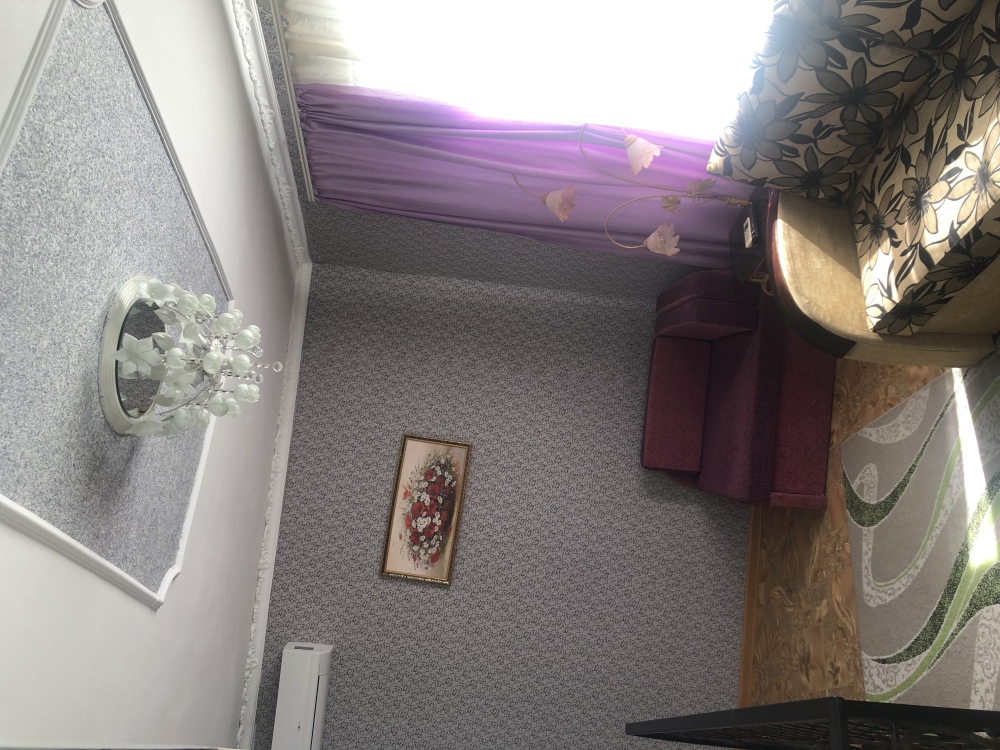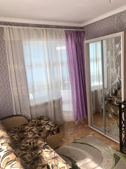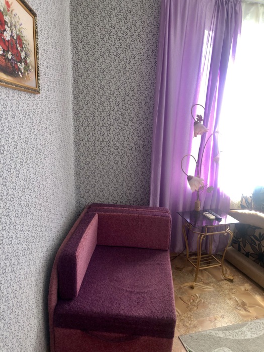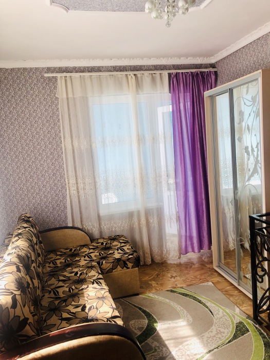 Одна просторная спальня позволят комфортно разместить 3 человека, прекрасный дизайн комнаты ,с перегородкой из портьер ,разделяет комнату на спальную зону и светлею зону с одним спальным местом .