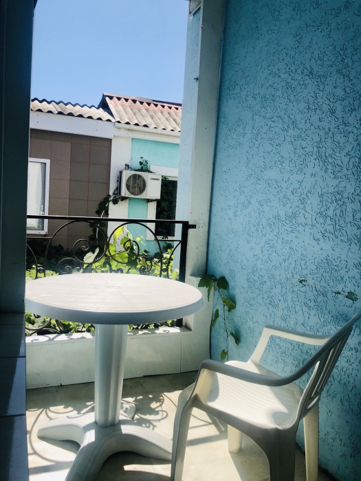 Есть балкон со столиком и стульями .