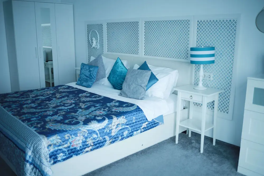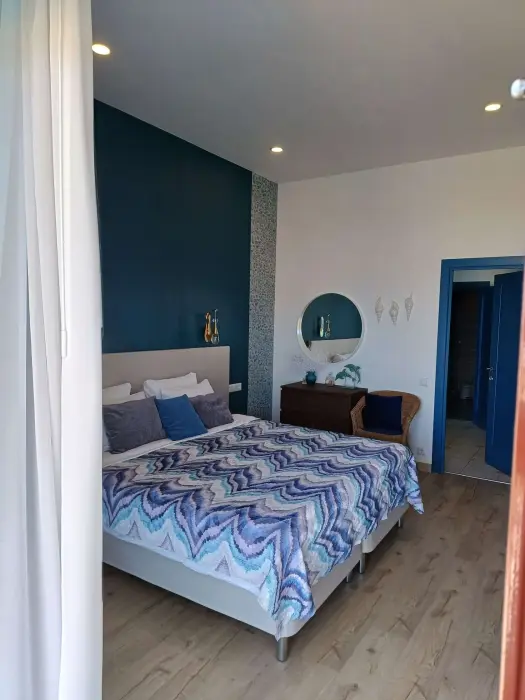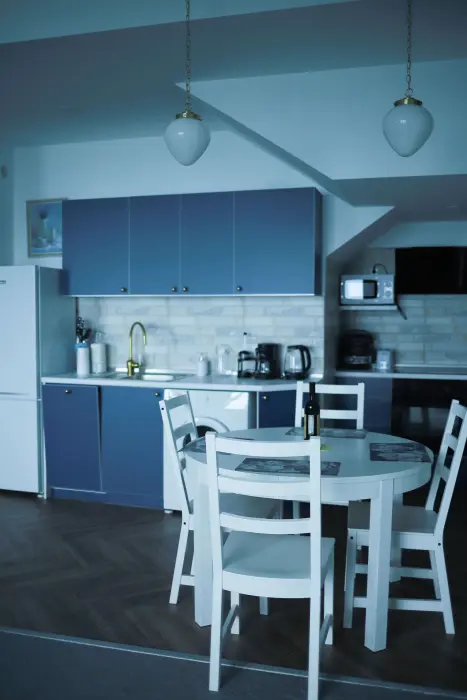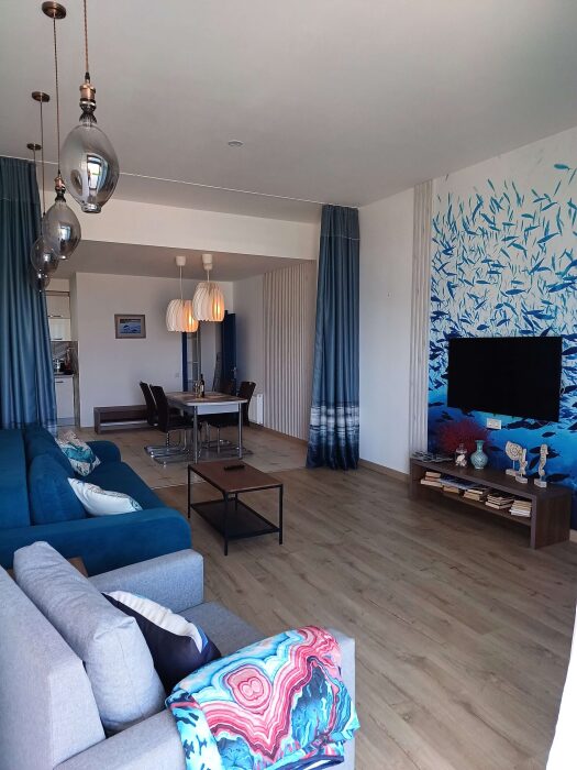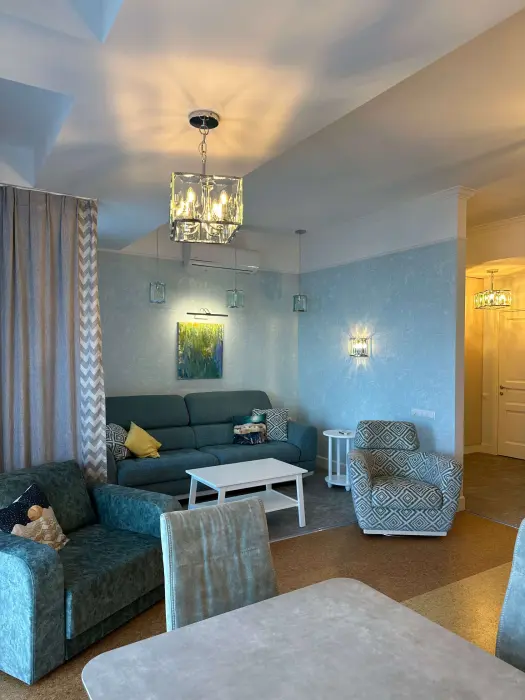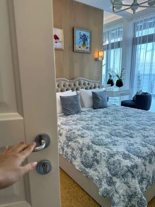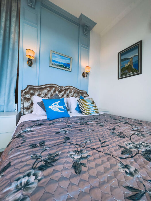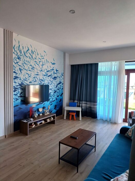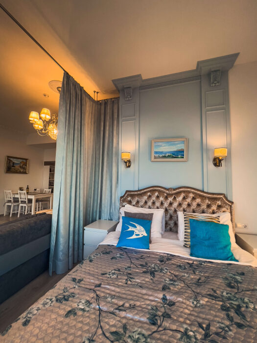 Оформлен во всех оттенках синего цвета. На стене рыбы, бра у кровати - медузы. Этот апартамент, как сказка о Русалочке. Очень уютный и комфортный. Из гостиной и спальни, через огромные панорамные окна-двери можно попасть на террасу - паттио, где стоит обеденный стол для семейной трапезы и качеля, на которой можно покачаться и помечтать о встречи с нашими черноморскими дельфинами - афалинами.