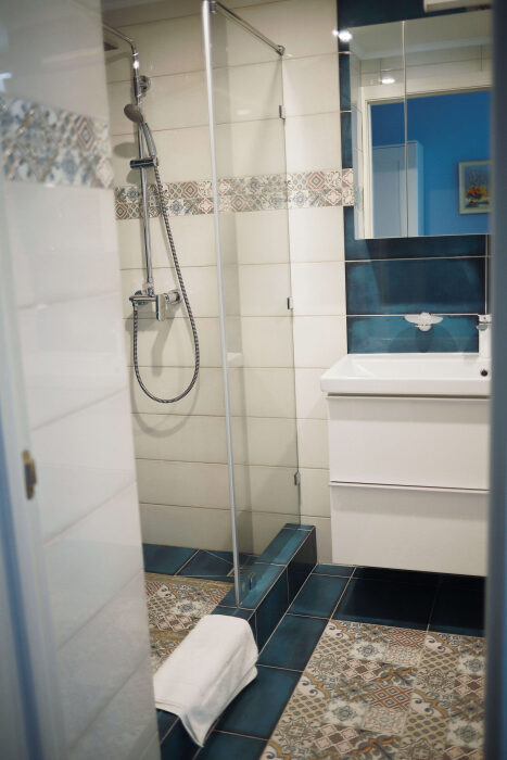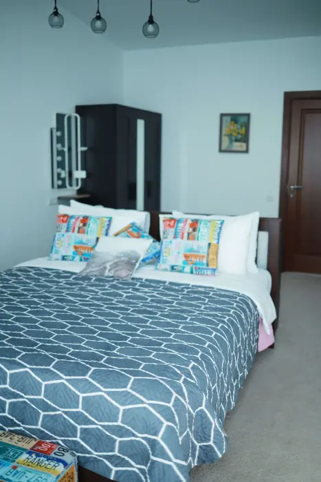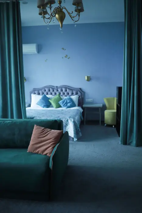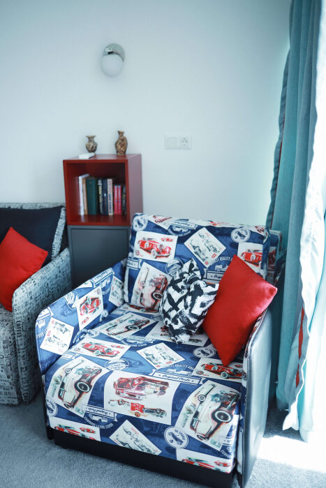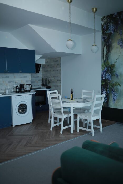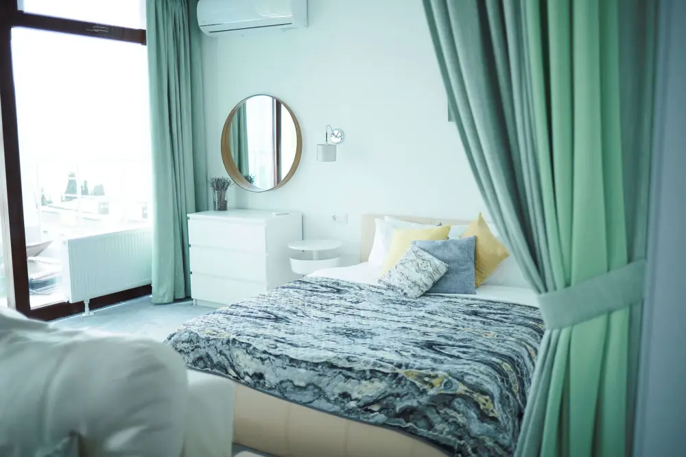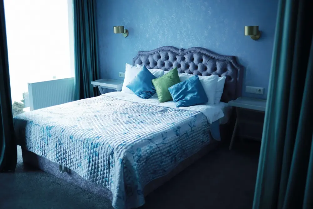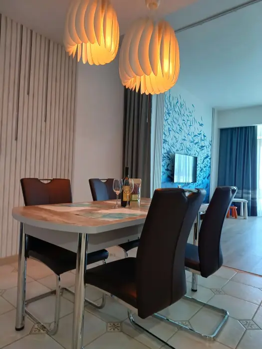 Оформлен во всех оттенках синего цвета. На стене рыбы, бра у кровати - медузы. Этот апартамент, как сказка о Русалочке. Очень уютный и комфортный. Из гостиной и спальни, через огромные панорамные окна-двери можно попасть на террасу - паттио, где стоит обеденный стол для семейной трапезы и качеля, на которой можно покачаться и помечтать о встречи с нашими черноморскими дельфинами - афалинами.