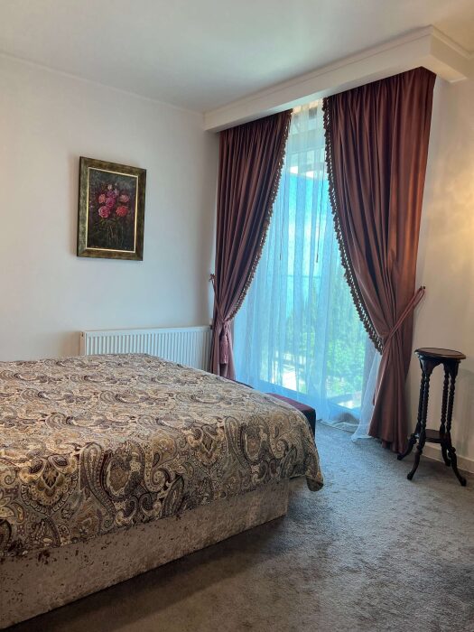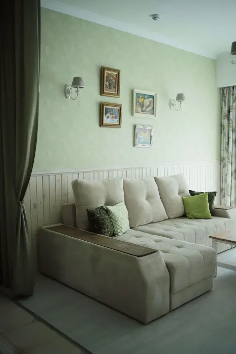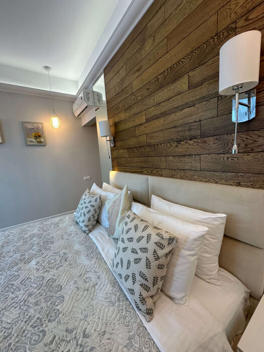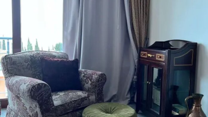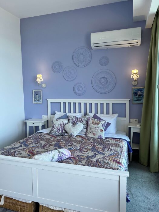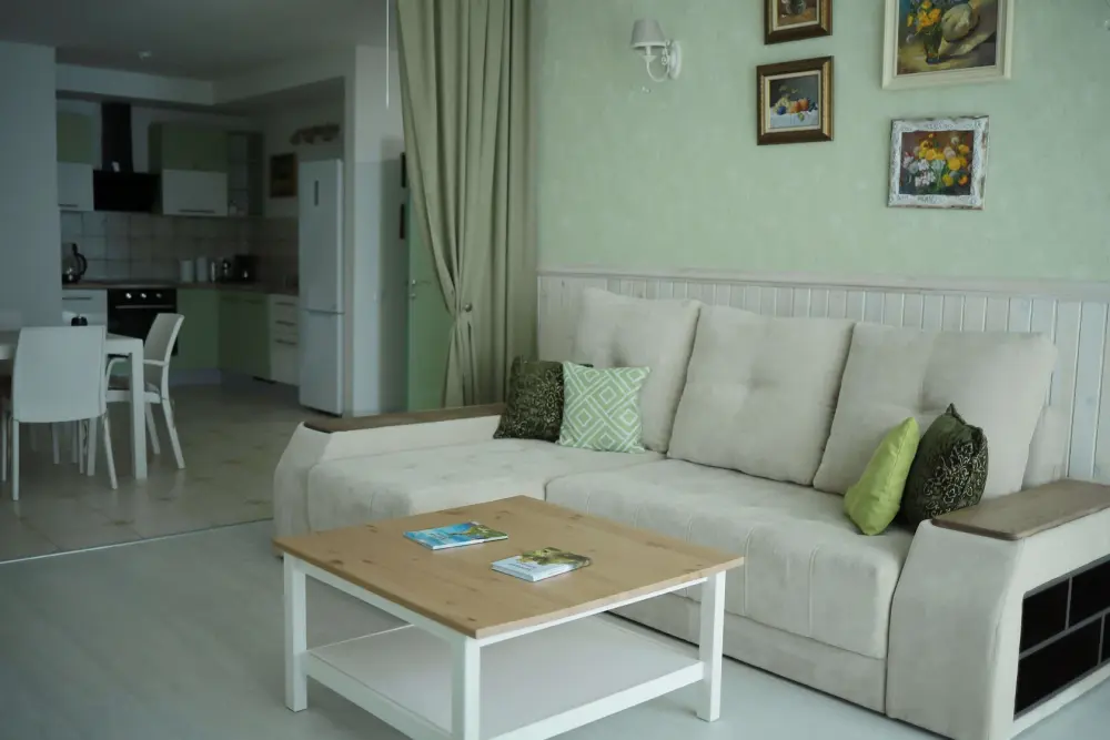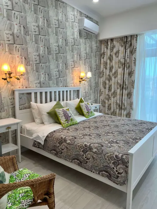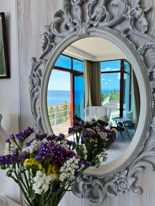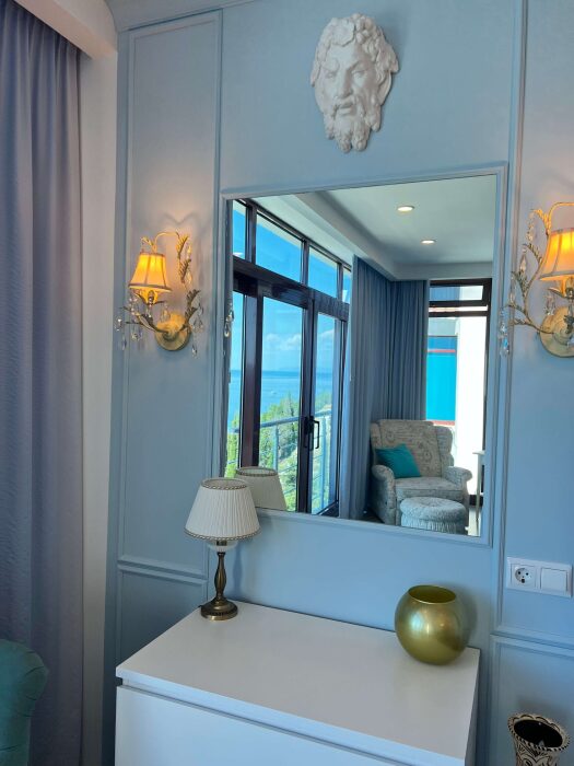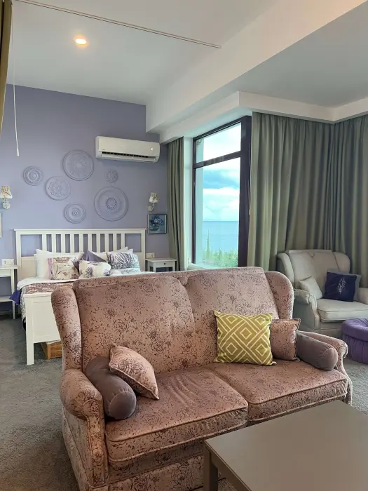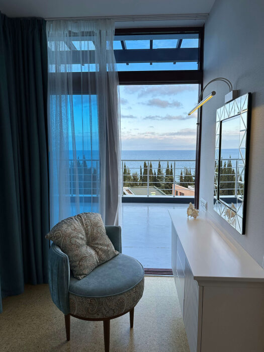 Роскошный апартамент в весенних оттенках цветущей Крымской глицинии. В нем будто чувствуется тот самый неповторимый аромат чудного растения — сладкий и нежный, слегка отдающий мёдом. Вид из панорамных окон на морскую гладь ложится идеальным завершающим мазком, как на картине.