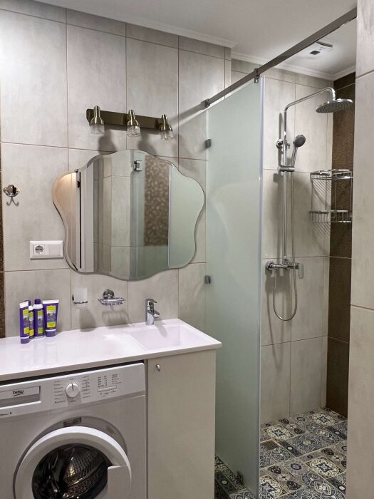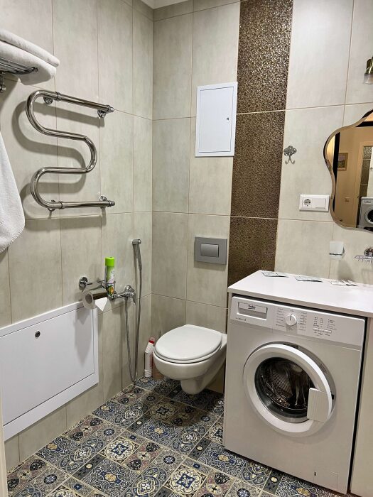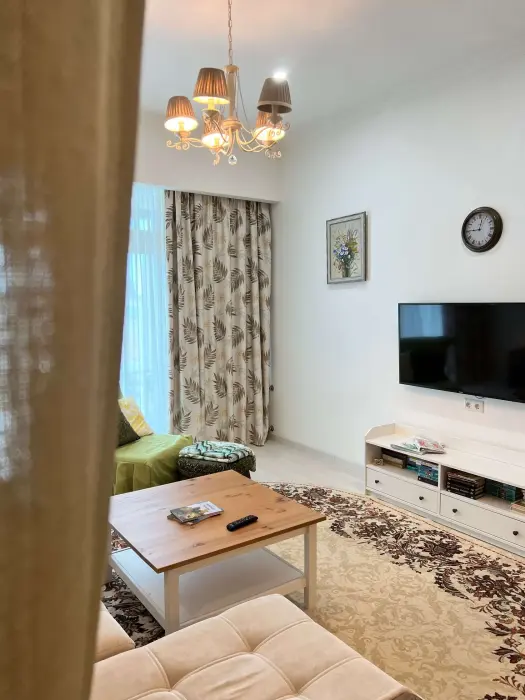 Просторный апартамент с изолированной спальней, кухней, гостиной и террасой. Дизайн выполнен в современном стиле. А на террасе можно отдыхать, загорать, собираться всей семьей за столом.