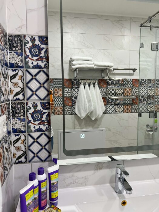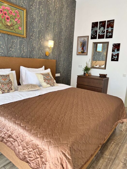 Этот апартамент оформлен в восточном стиле. При входе вас будет встречать птица-павлин, на стене настоящий ковер у кровати тумбочки ручной работы а у зеркала настоящая лампа Алладина, можно загадывать желание. Ведь этот апартамент - это настоящая восточная сказка. А море за огромными панорамными окнами, только усиливает эффект ожидания чуда.