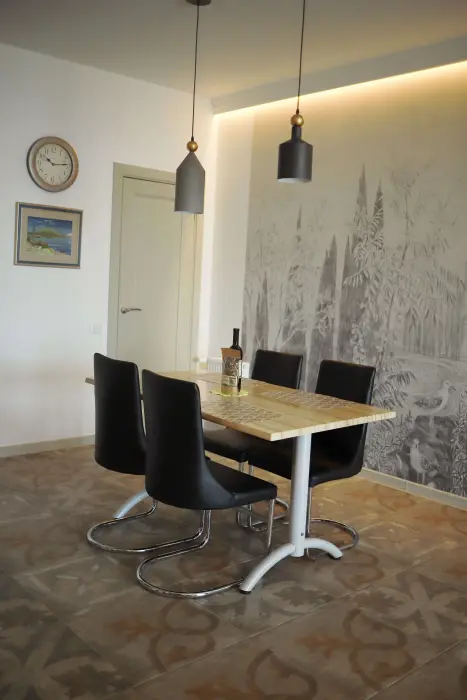 Оформлен в легком современном стиле. Попадая в этот апартамент, пространство вокруг вас будто раздвигается. Есть две уютные спальни и из каждой можно попасть на террасу. Панорамные окна, огромная терраса, на которой расположено несколько зон отдыха и стоит обеденный стол, за которым дружной большой семьей можно выпить утренний кофе или устроить праздничный ужин. а можно просто посидеть на качели и почитать книжку из нашей библиотеки.