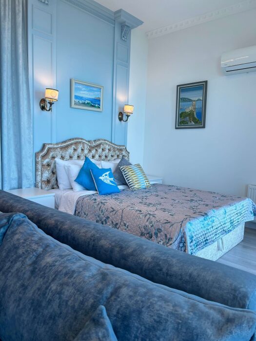 Оформлен в небесно-голубом цвете, в стиле бохо. Очень яркий и жизнерадостный Попадая в это пространство, вы будто оказываетесь в сказке. Из огромных панорамных окон открывается великолепный вид на море, занавески, словно паруса раздувает легкий морской бриз. А расположившись в кресле у окна, можно взять книгу из небольшой библиотеки и расслабиться перелистывая странички.