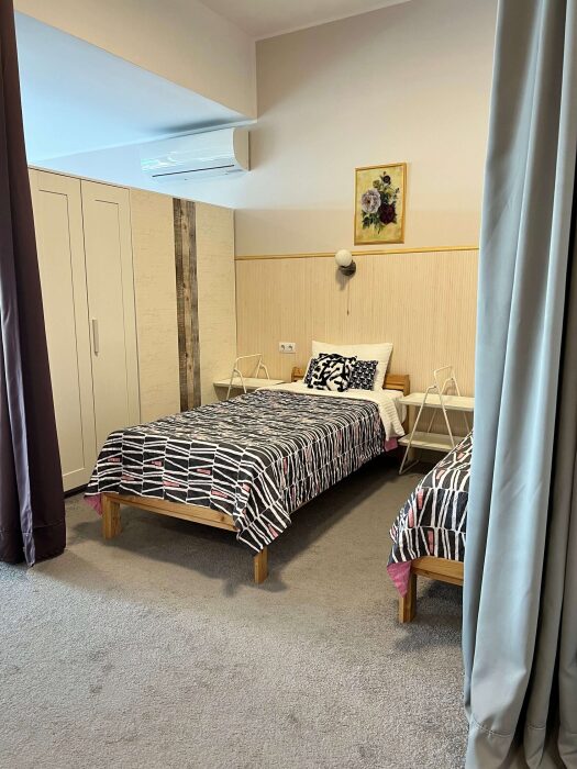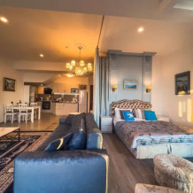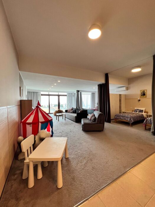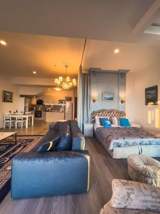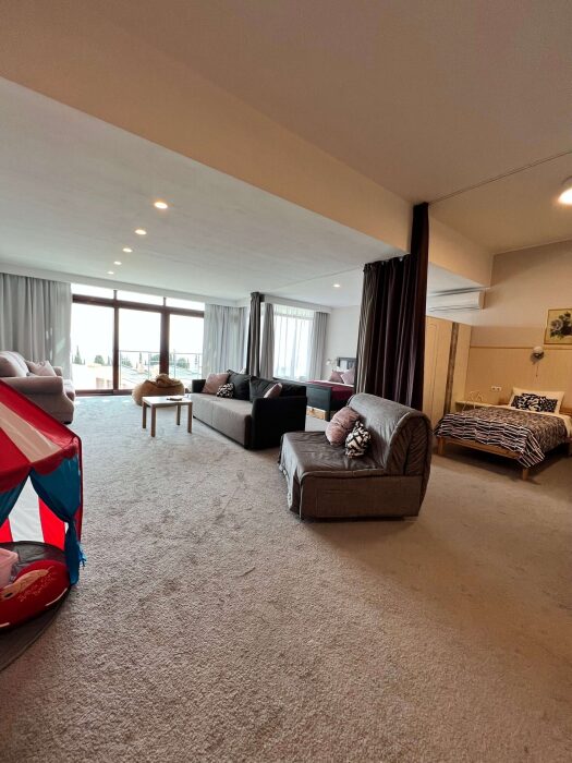 Самый большой апартамент студийного типа. Апартамент поделен на несколько зон: игровая, 2 спальные, кухня и гостиная. В нем нет межкомнатных стен, но для вашего комфорта и уюта спальные места можно деликатно оградить имеющейся шторой.