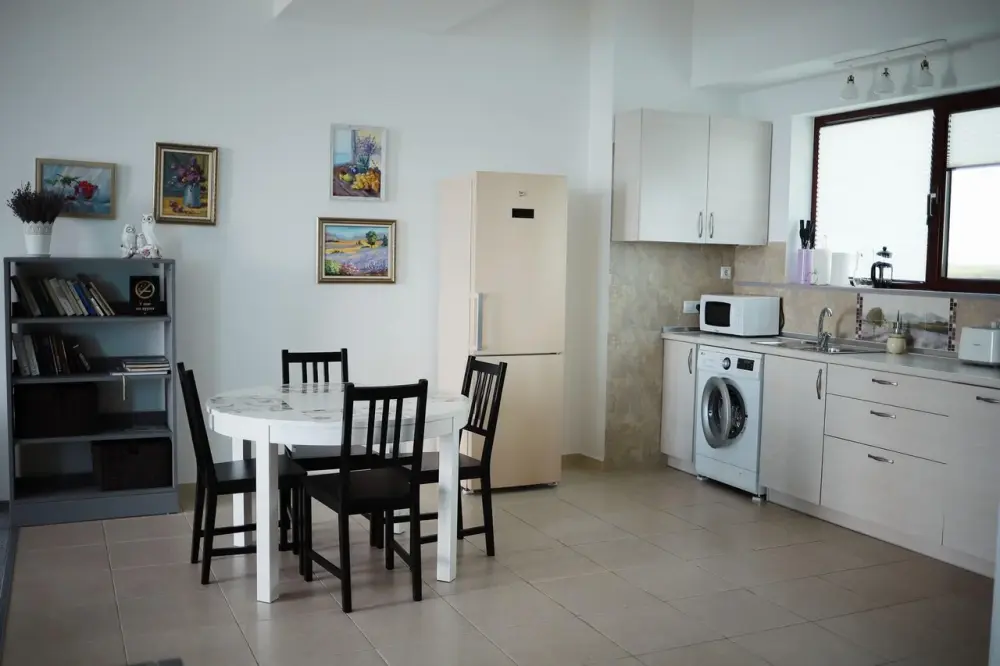 Полный комплект бытовой техники, как дома, приветственный презент: бутылка крымского вина и крымский чай.