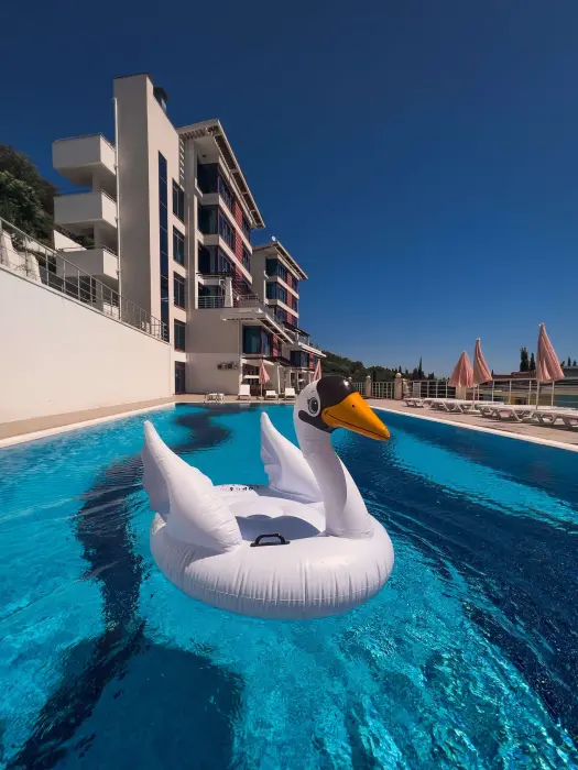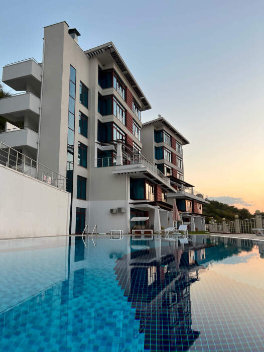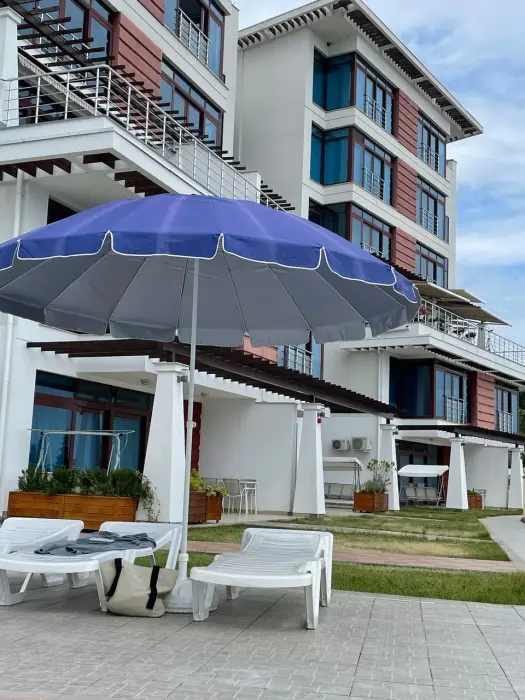 Из окон апартаментов открывается прекрасный вид на море. Утром можно наслаждаться великолепными восходами солнца, а вечером фантастическими закатами. На территории апартаментов открытый сезонный бассейн с подогреваемой водой. Все апартаменты в идеально чистом состоянии с соблюдением всех стандартов гигиены и безопасности, в том числе для самых маленьких гостей.