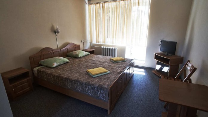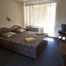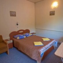 Комнаты с балконом, обращенным в сторону моря, расположены на 2-м и 3-м этаже четырехэтажного здания, вид на внутренний озелененный двор, с балконов 3-го этажа видно море. В наличии балкон с сушкой и мебелью, с/узел, душ, TV, сейф, эл.чайник, холодильник, кондиционер. Кровати двуспальная либо 2 односпальных, доп.место – кресло-кровать или диван-дельфин.