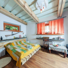 Однокомнатный комфортный номер с одной двуспальной и одной односпальной кроватью в даче-отеле в стиле 30-х гг «Гранж Авангард». В номере - две тумбочки, два стула, стол, холодильник, телевизор, электрочайник, фен. Ванная комната с душем и туалетом.