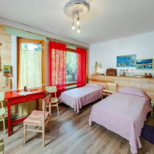 Однокомнатный комфортный номер с одной двуспальной и одной односпальной кроватью в даче-отеле в стиле 30-х гг «Гранж Авангард». В номере - две тумбочки, два стула, стол, холодильник, телевизор, электрочайник. Ванная комната с душем и туалетом.