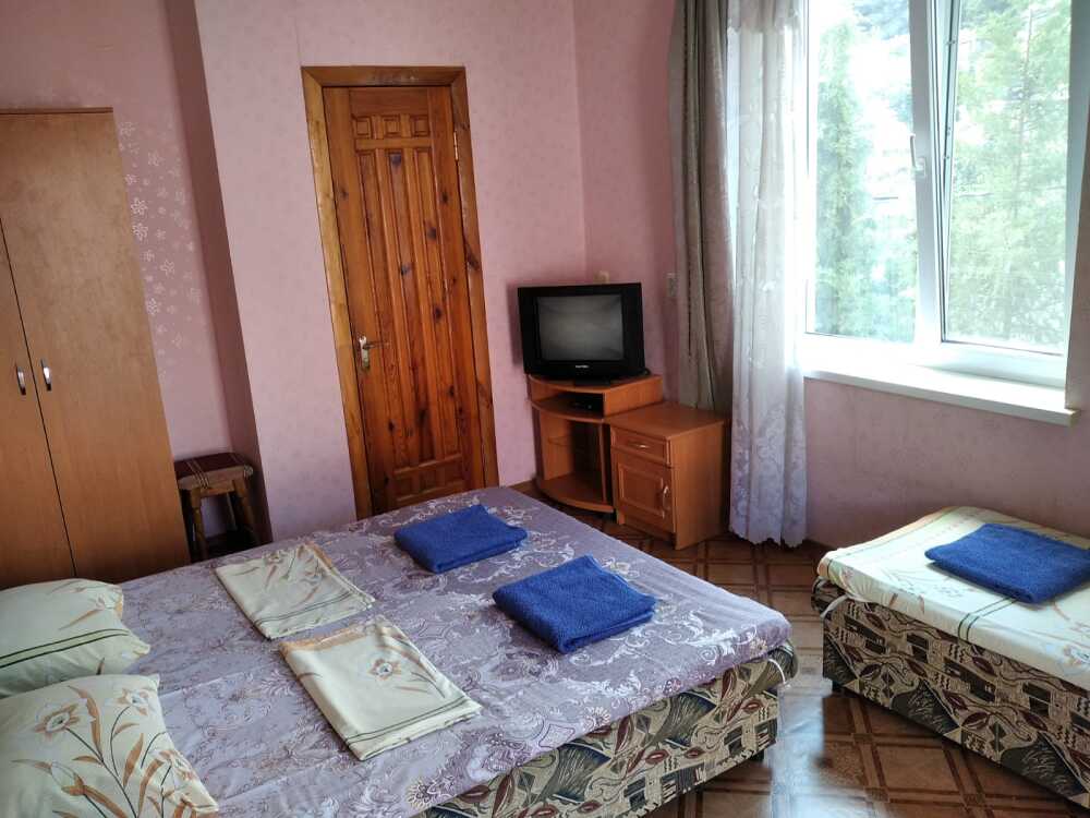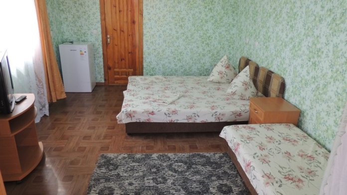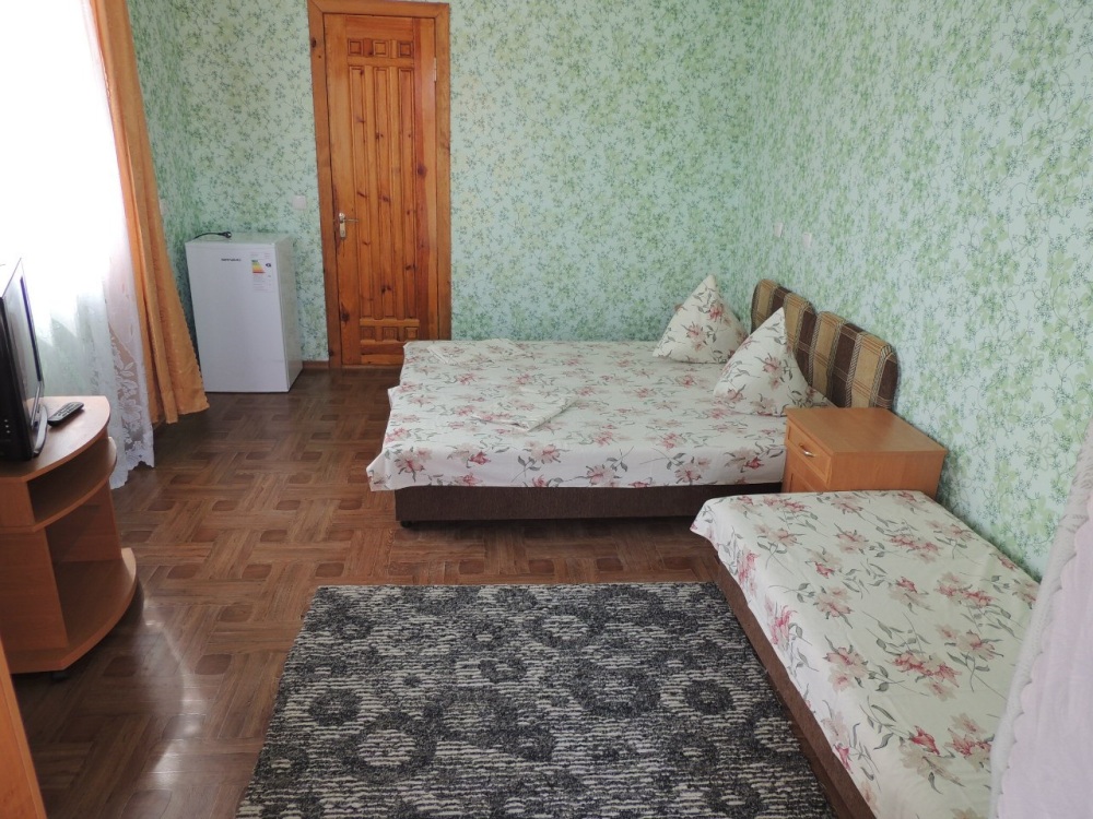 В номере двухспальная кровать, три односпальные кровати, шкаф для одежды, тумбочки, душ, туалет, умывальник (холодная и горячая вода - постоянно), телевизор, холодильник, кондиционер, по желанию вентилятор, Wi-Fi.