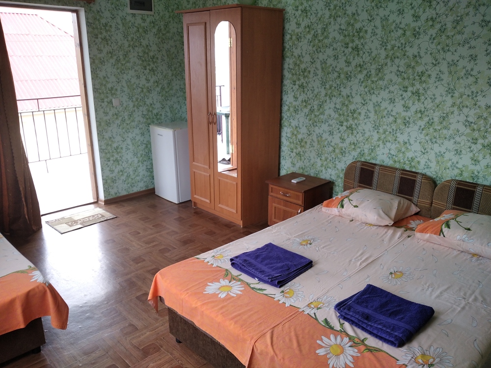 В доме 6 номеров для проживания от 2 до 5 человек. В каждый номер отдельный вход с террасы. В номерах: душ, туалет, умывальник (холодная и горячая вода - постоянно), кровати, тумбочки, шкаф для одежды, телевизор, холодильник, кондиционер, WI-FI.