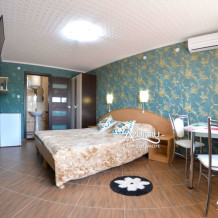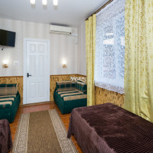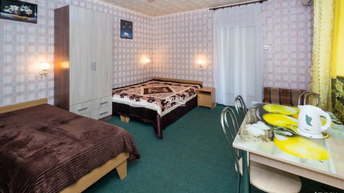 В каждом из номеров гостевого дома свой санузел, кондиционер, холодильник и приличная мебель. Для каждых трёх номеров своя терраса с кухней и столовой с индивидуальным столиком для каждого номера. У «Семейного» номера свои кухня и столовая. На втором этаже номера с небольшими столовыми в каждом номере, на третьем этаже номера поскромнее.