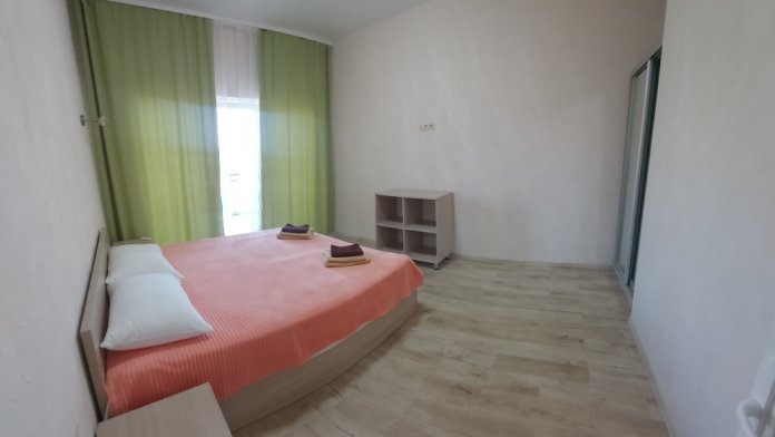 Просторный двухкомнатный номер с кухней 40 кв.м . В номере 1 двухспальная кровать и две односпальных кровати . Кухонный ряд. Холодильник, микроволновка, кондиционер, телевизор, чайник, кухонная посуда, столовые приборы, фен.