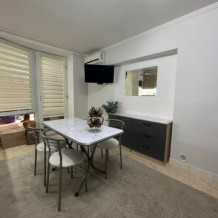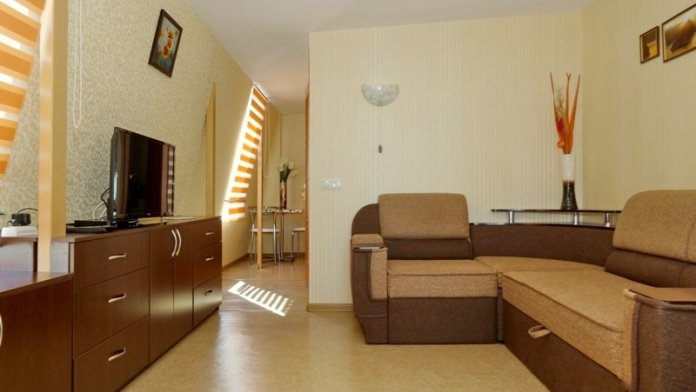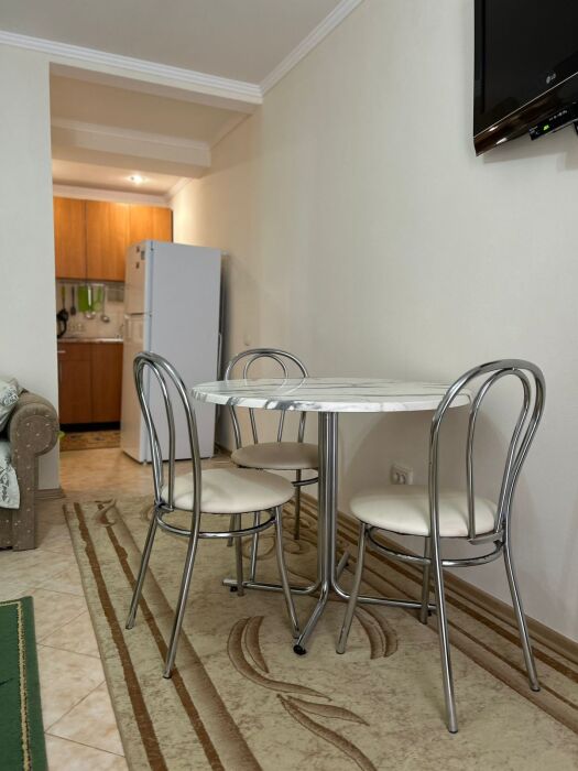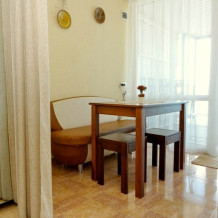 В номере: новая мебель, телевизор, беспроводной интернет с хорошей скоростью, холодильник, кухня, душ и санузел. В ванной комнате всегда полный флакон жидкого мыла, шампунь, гель - в одноразовых пакетах, полотенца идеальной чистоты, фен. Белье меняется раз в пять-шесть дней.