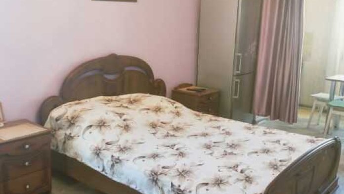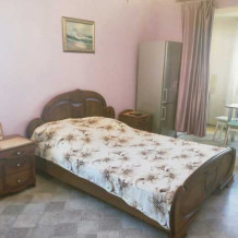 - большая комната (зал) - шкаф, двуспальная кровать, две тумбочки и комод, кондиционер, телевизор (спутниковое телевидение «Триколор»), предоставляется постельное бельё и банные полотенца.