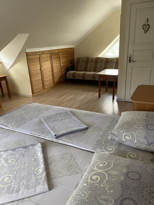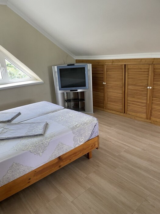 номер с санузлом ( на мансарде), есть общая большая кухня для самостоятельной готовки, беседка, мангал, бассейн, сауна