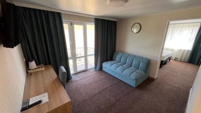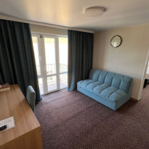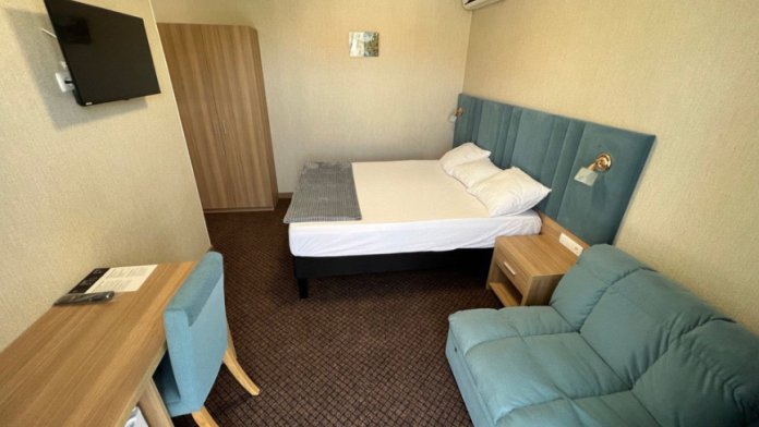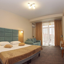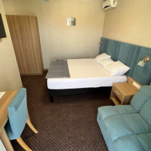Есть номера с двумя раздельными кроватями, либо с двухспальной + кресло-кровать. Стоимость проживания 1 человека в данном номере с 2-разовым питанием - 3500 р в сутки