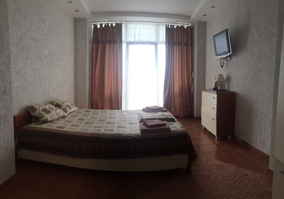 Уютный номер рассчитан на размещение от 4 до 5 человек: в номере большая двуспальная кровать и 2 односпальные кровати, дополнительное место (еврораскладушка) - комнаты раздельные; холодильник, кабельное TВ, кондиционер (в каждой комнате), чайник, шкаф, трюмо, санузел (горячая вода), балкон с видом на море, Wi-Fi.