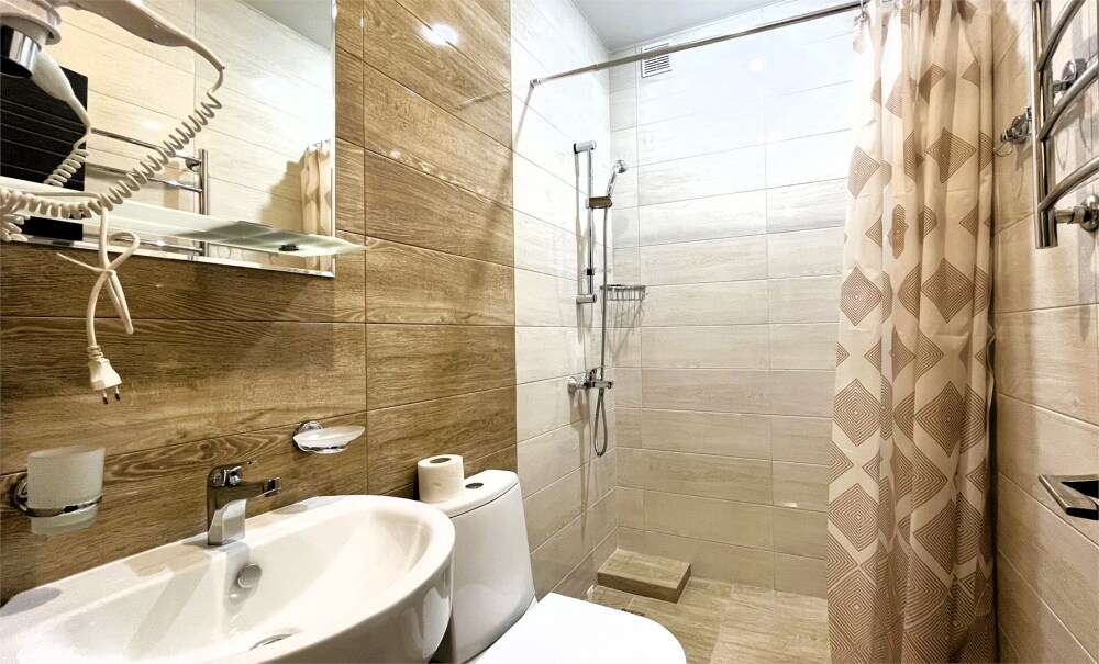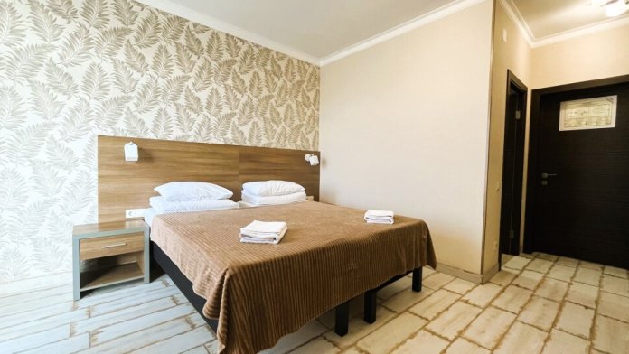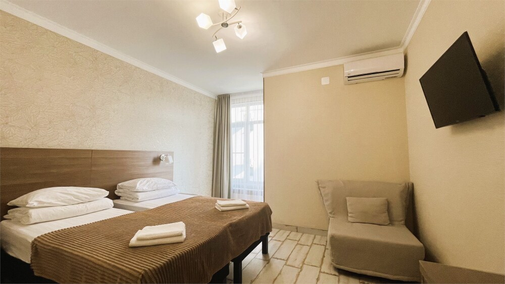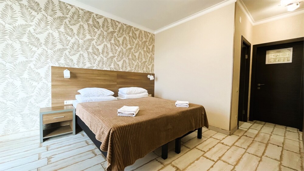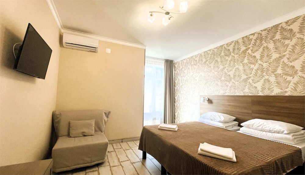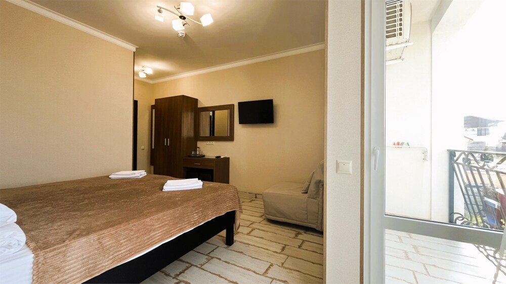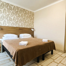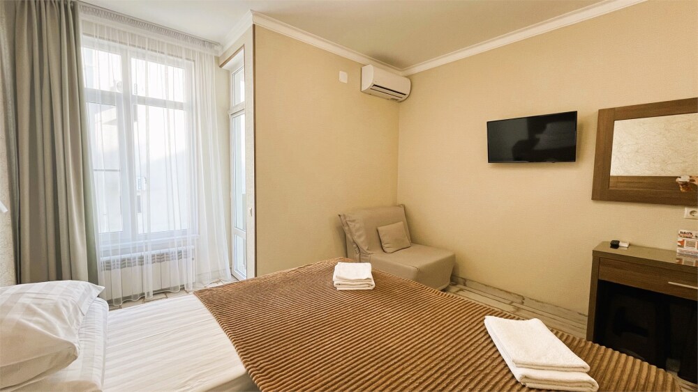 В номере: двуспальная или две раздельные кровати, кресло-кровать, шкаф для одежды, телевизор, кондиционер, трюмо, зеркало, ванная (душ, туалет, раковина, фен, тапочки, туалетные принадлежности), балкон.
