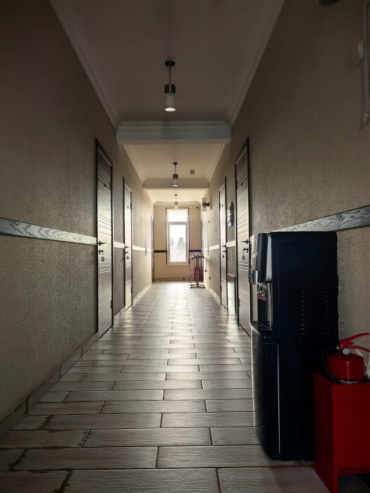На территории находится общая кухня, парковка (за доп. плату), места отдыха, мангал, кулеры на этажах.
