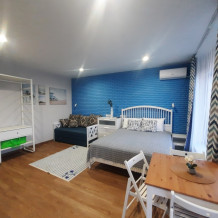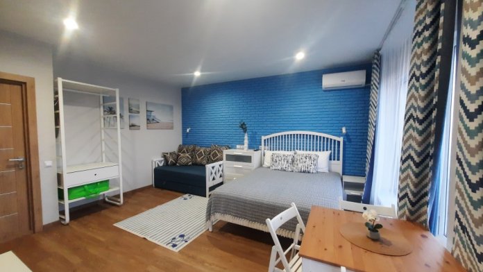 В апарте большая двухспальная кровать, отличный раскладной диван ( с него тоже видно море), обеденная зона на 4 гостей, открытый гардероб, комод, тумбочка и др. удобства в номере. Мини-кухня оснащена холодильником, микроволновкой, чайником, мультиваркой, плита индукционная настольная, разнообразная посуда, бокалы и штопор!