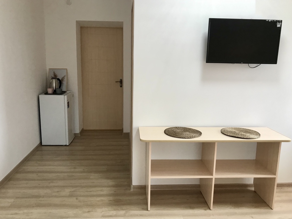 Номер оборудован мебелью и техникой для комфортного проживания: двуспальная кровать и двуспальный диван, прикроватные тумбочки, шкаф, зеркало, кондиционер, холодильник, телевизор, чайник. Фен, утюг и микроволновая печь имеются на этаже.