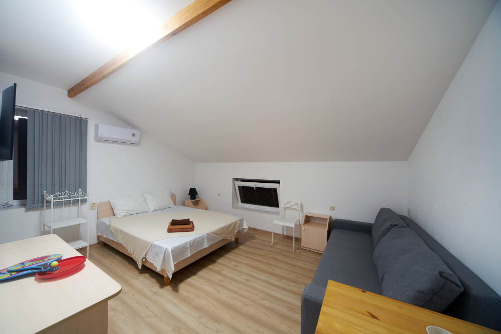 Для размещения своих гостей мини-отель предлагает двух- или трехместные комфортабельные номера. Все номера оборудованы необходимой мебелью, кондиционером, холодильником, душевой комнатой и интернетом wi-fi. На прилегающих балконах, оснащенных летней мебелью, Вы можете насладиться прекрасными крымскими вечерами. Мини-отель располагает местами для автостоянки.