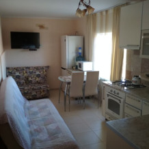 Однокомнатный номер на 1 этаже коттеджа. В номере двухспальная кровать и раскладной диван. Кухня индивидуальная в номере. Душ, туалет, ТВ, wi-fi, кондиционер. Выход на террасу и во двор с зоной для отдыха и барбекю.