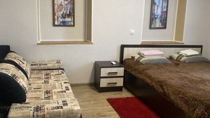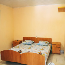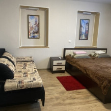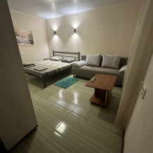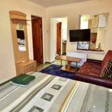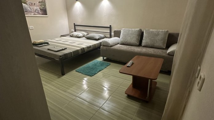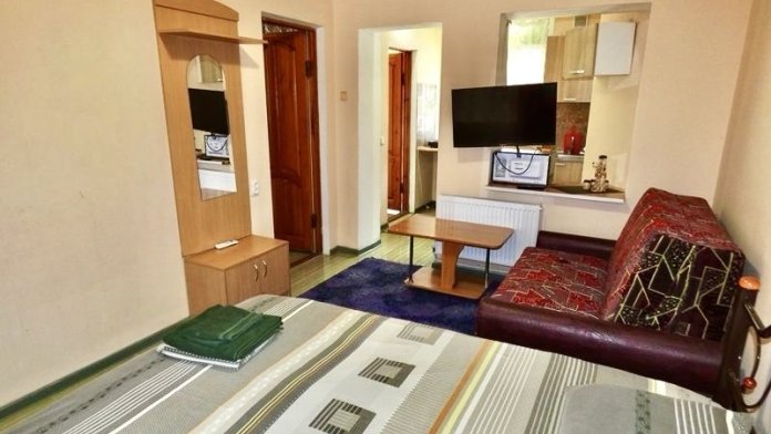 Комфортные номера расположенные на первом этаже. В комнате есть кондиционер, телевизор, холодильник, мини-кухня, 1 двуспальная кровать, 2 раздвижных двухместных дивана, гардеробная стойка, посуда.