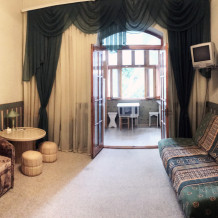 В комнате два 2-спальных дивана столик шкаф. Есть постельное белье на 4 человека и полотенца. На кухне мебель, плита, холодильник. Санузел совместный, душ, туалет.