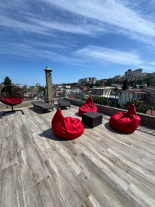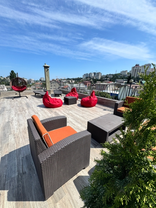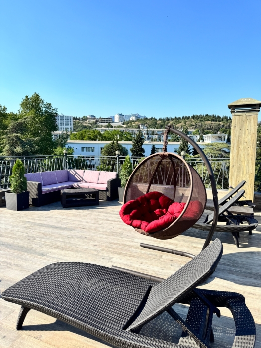 Также в нашем Гостевом доме есть шикарная смотровая лаунж-зона с шезлонгами для загара и мебелью для отдыха.