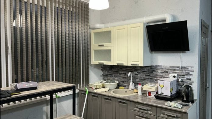 Кухня на этаже одна на два номера, на кухне чайник, посуда, СВЧ.