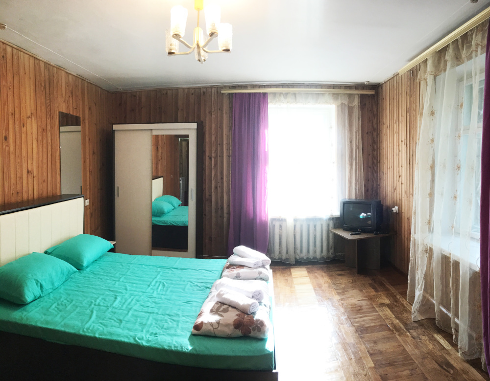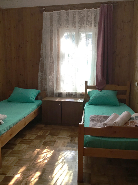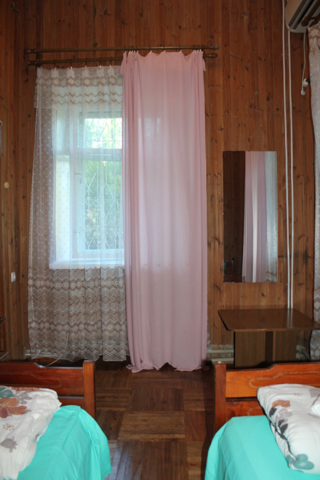 Номер состоит из двух раздельных комнат и одного санузла. Расположен на втором этаже двухэтажного здания. В номере 4 односпальных кровати, по две кровати в каждой комнате. В каждой комнате шкаф, телевизор, тумбочка, зеркало, кондиционер. Санузел совмещен. Душ раковина унитаз. Предоставляется постельное белье, полотенца, тапочки, шампунь, мыло.