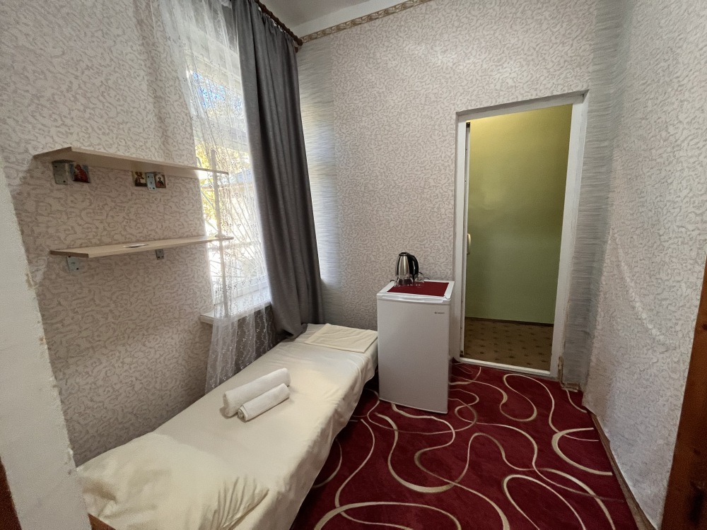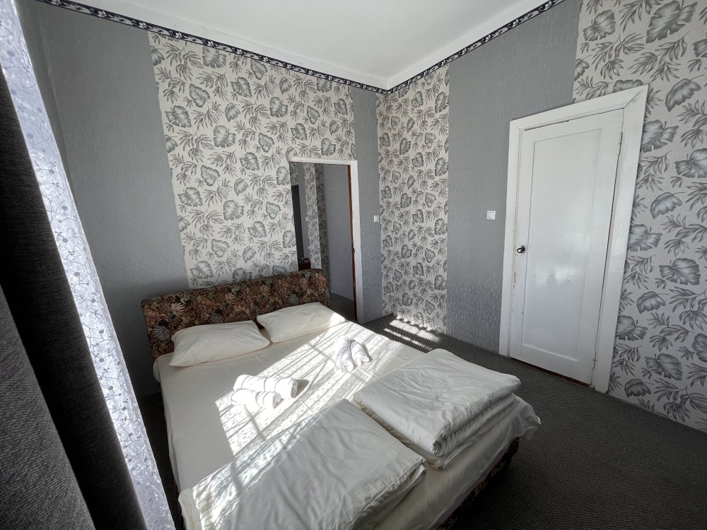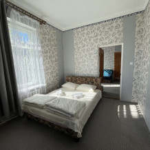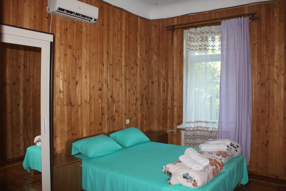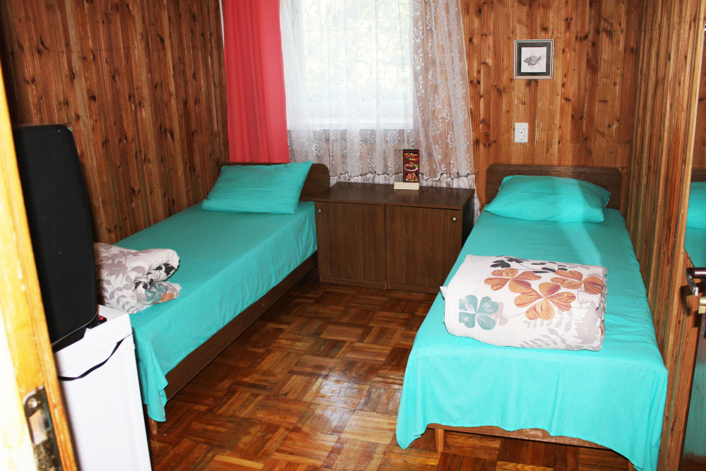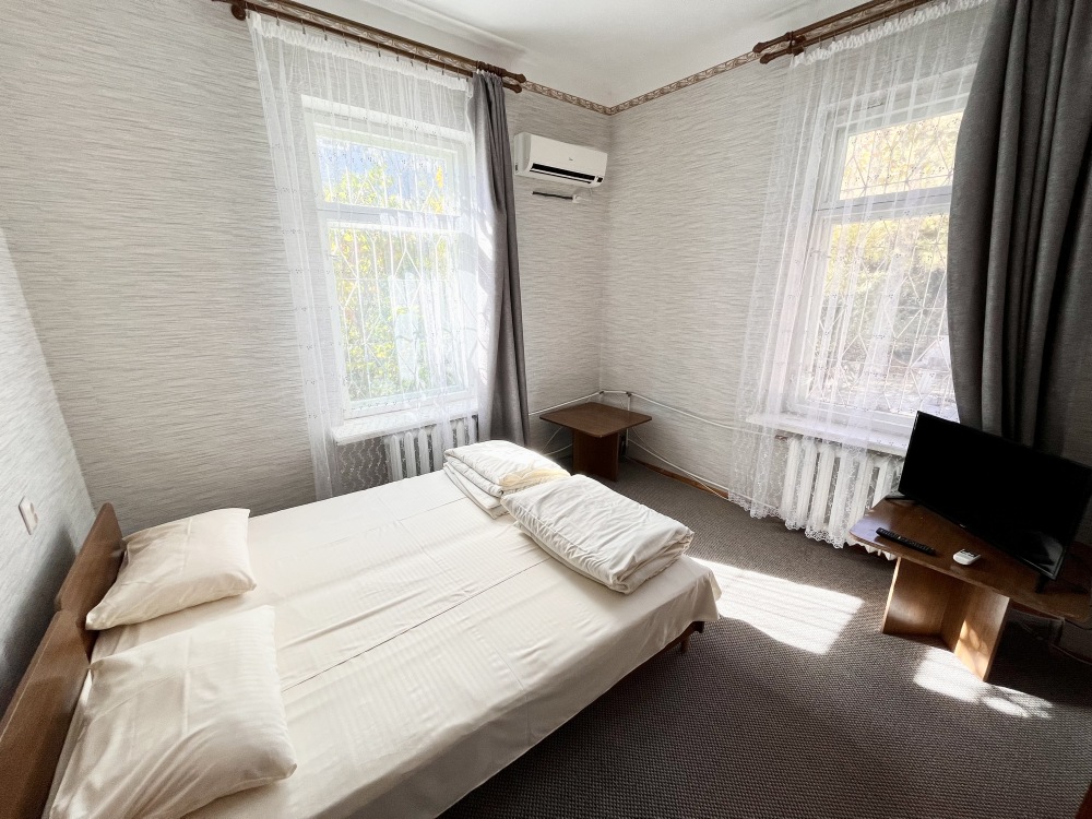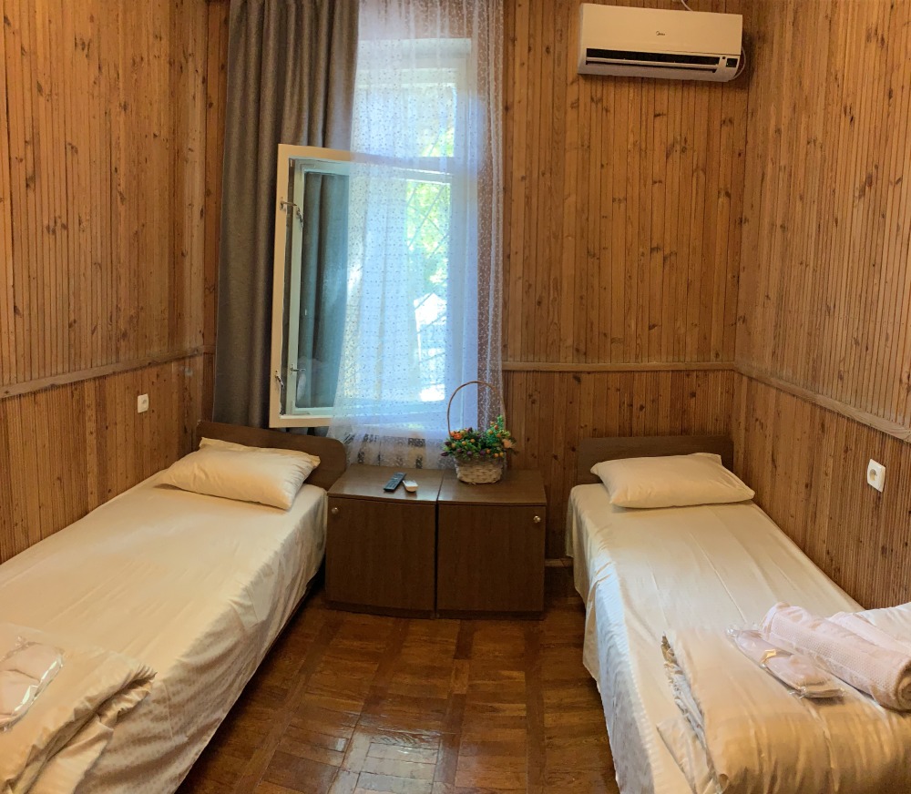 Двухкомнатный 3-местный номер. В одной комнате две односпальные кровати, в меньшей комнате одна односпальная кровать. В номере телевизор, холодильник, кондиционер. Свежее постельное белье, полотенца, мыльные принадлежности.