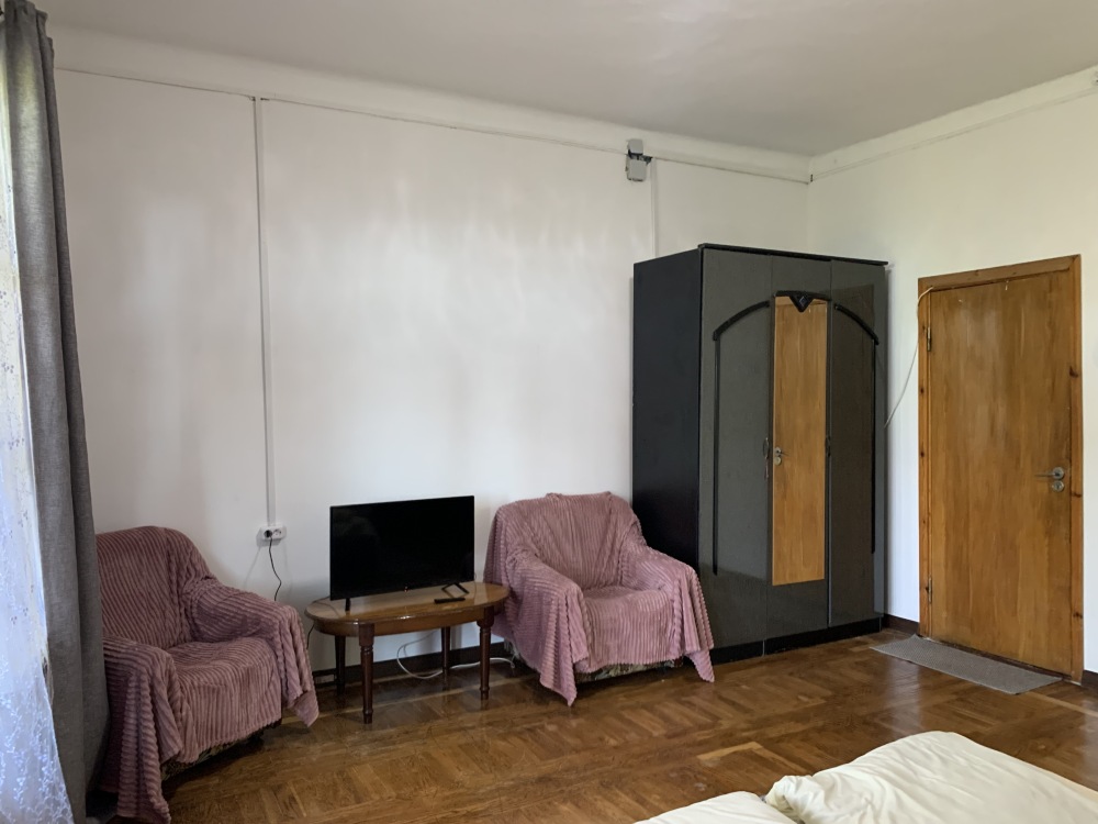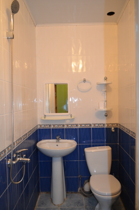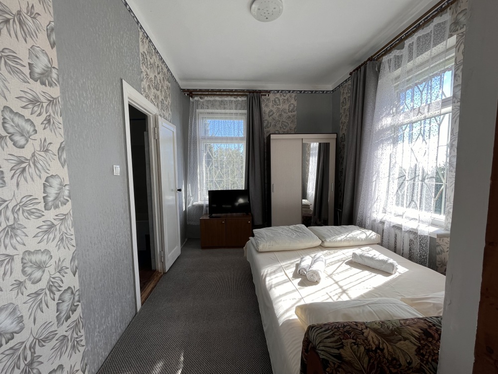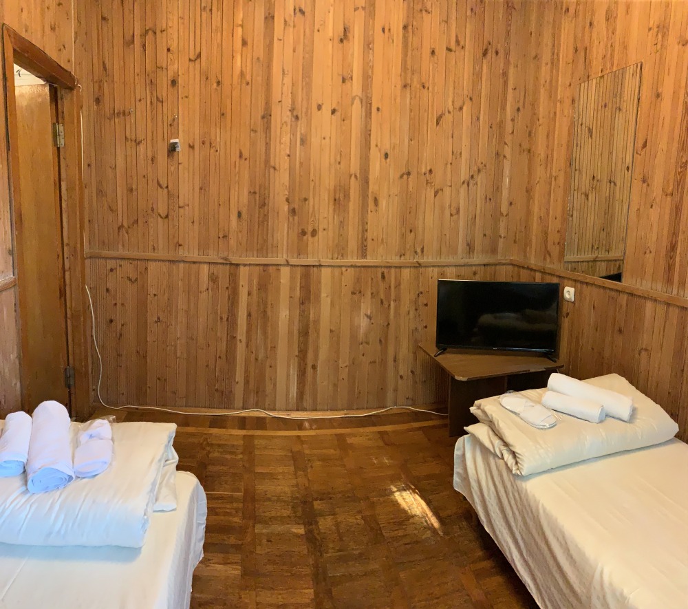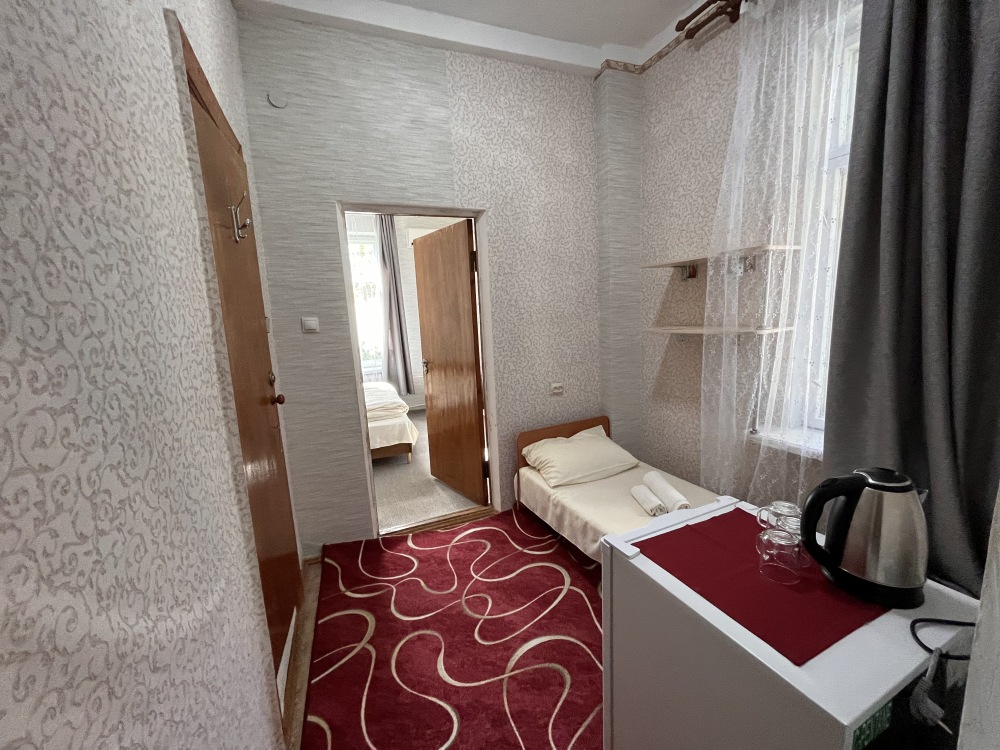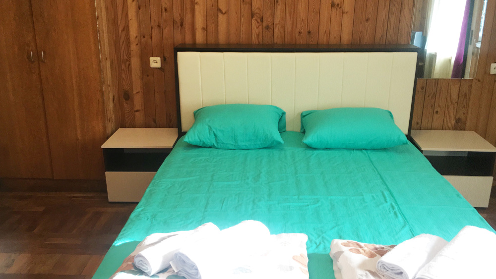 Двухкомнатный 3-местный номер. В одной комнате две односпальные кровати, в меньшей комнате одна односпальная кровать. В номере телевизор, холодильник, кондиционер. Свежее постельное белье, полотенца, мыльные принадлежности.