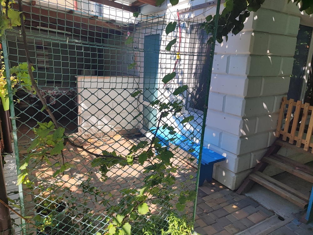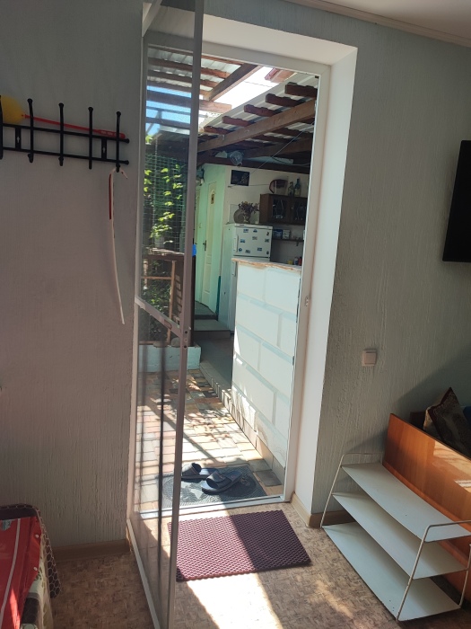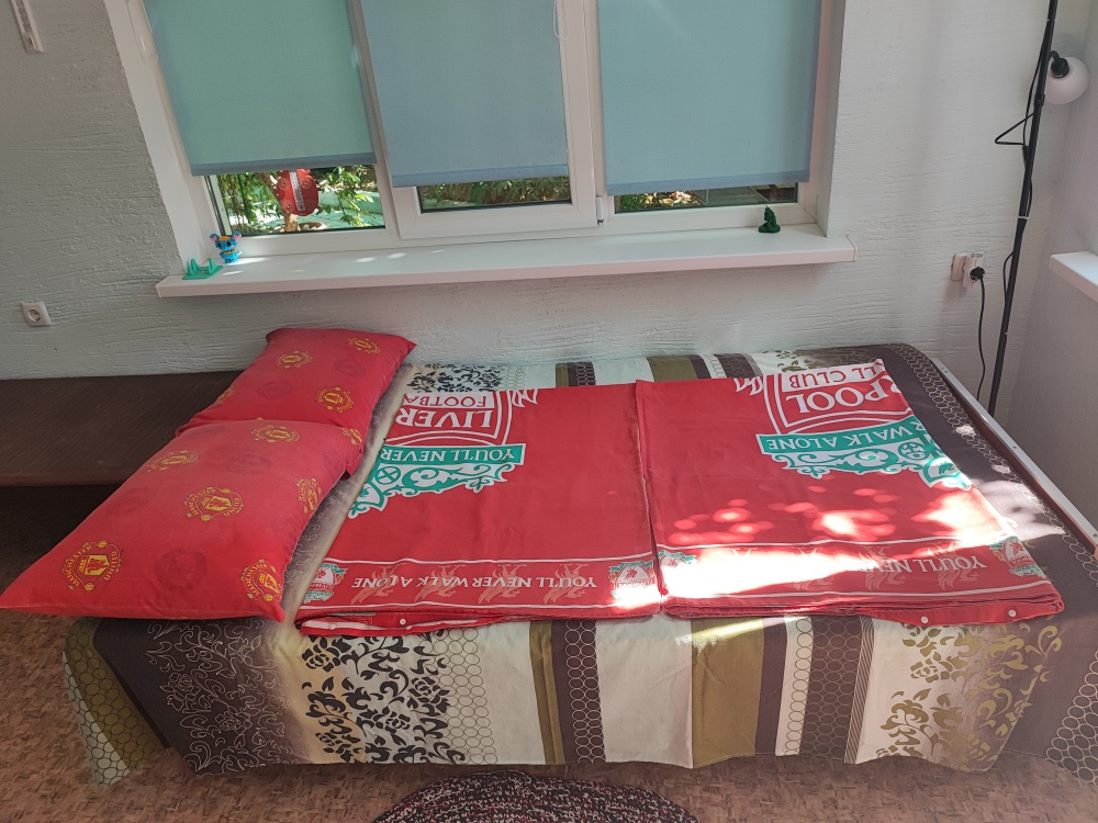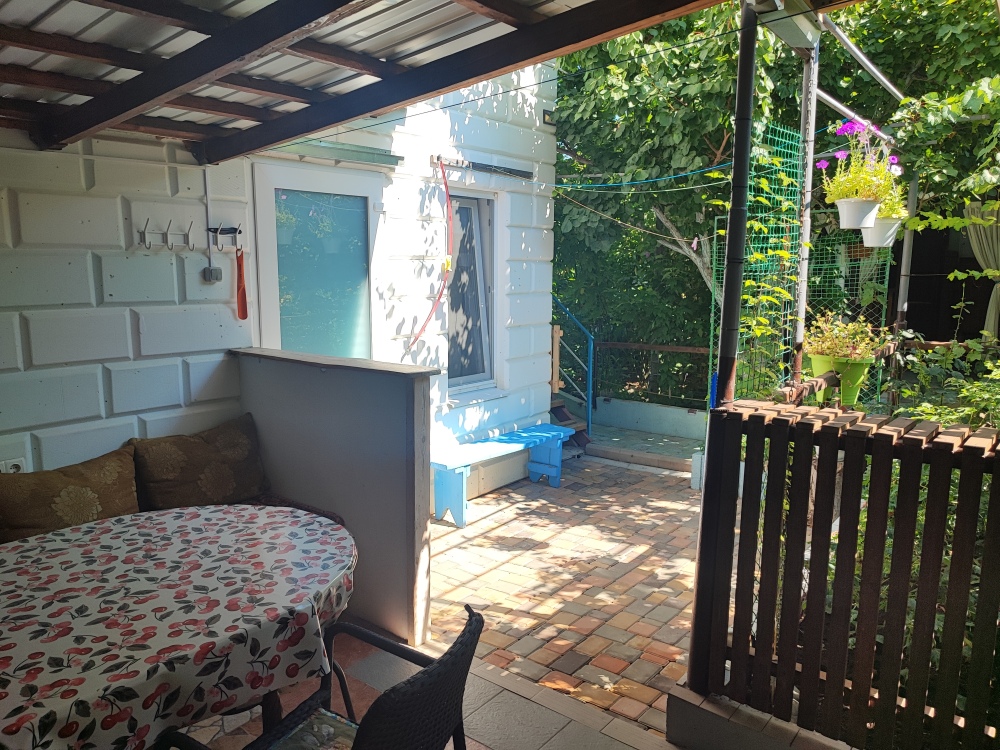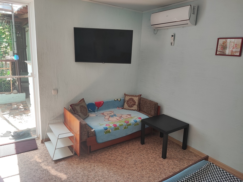 На первом этаже расположена комната с большой двухспальной кроватью, односпальным раскладным диваном и раскладным мини-диваном. Также в комнате, на первом этаже есть телевизор со Smart TV и кондиционер. В каждом из номеров есть шкаф для вещей. На улице, возле комнаты, находится веранда с обустроенной кухней и холодильником. Рядом с номером расположен совмещенный душ с туалетом и отдельный туалет. Помимо всего прочего на территории дачи есть мангальная зона со всем необходимым для готовки. Кстати,окна номера оснащены защитой от ультрафиолетовых лучей.