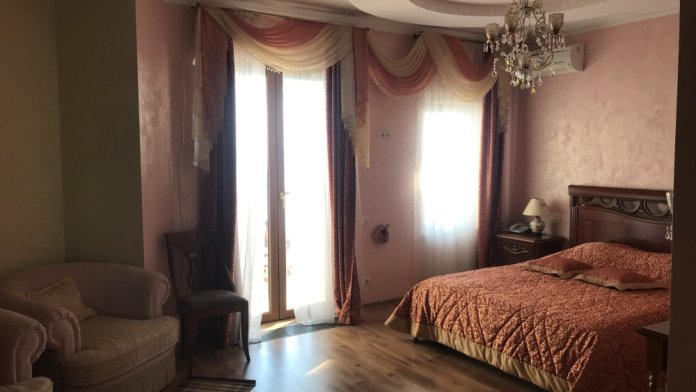 Просторный уединенный ЛЮКС (занимает весь этаж) с кухней 2 с/у душ джакузи Две террасы с великолепными видами на море (первая линия) два балкона Кровать «King size» и двуспальный диван-кровать На диване шикарный топер Рабочий стол 2 ТВ 2 кондера камин косметический столик 4 шезлонга 4 кресла Дизайнерский ремонт На кухне есть все: посуда кулер кофеварка посудомойка СВЧ большой холодильник